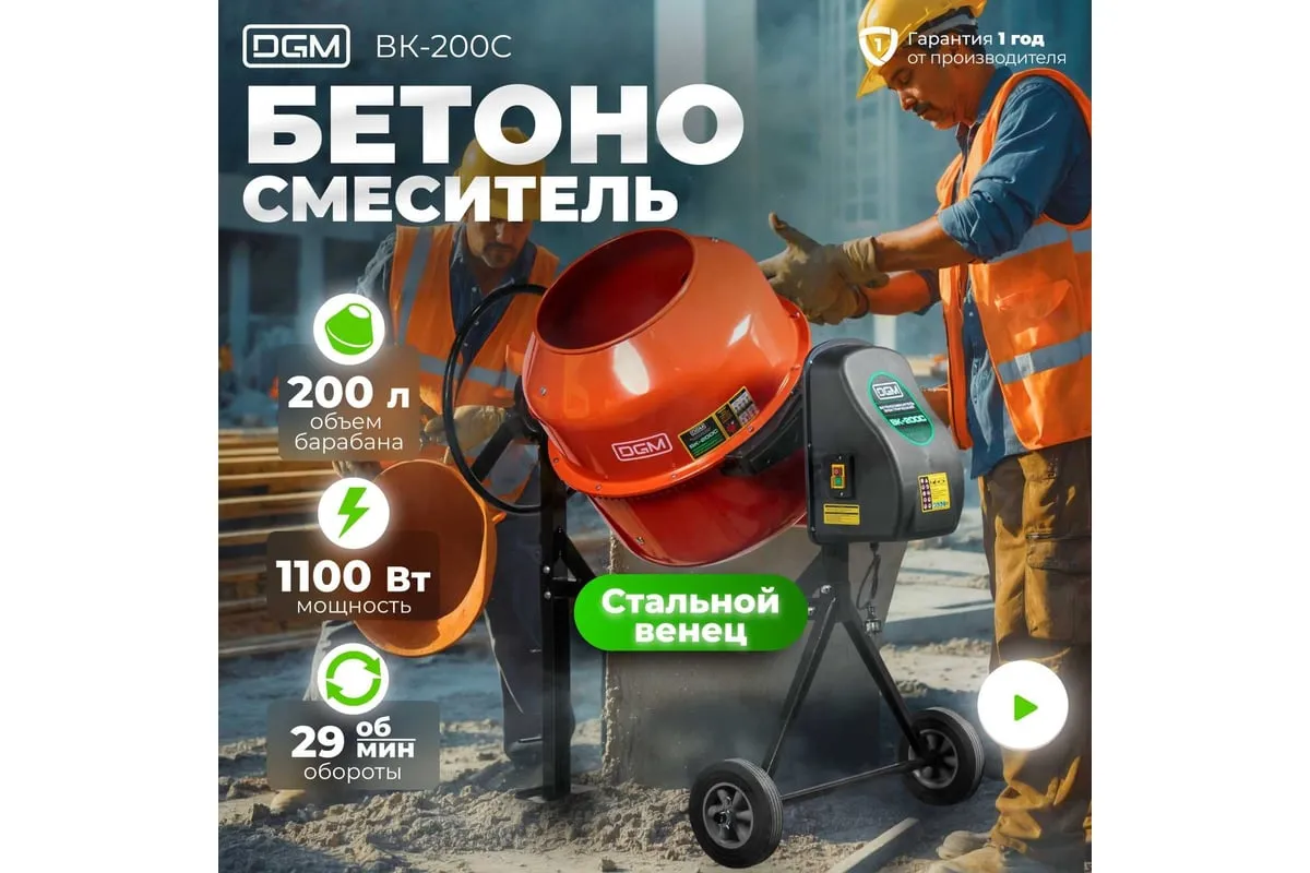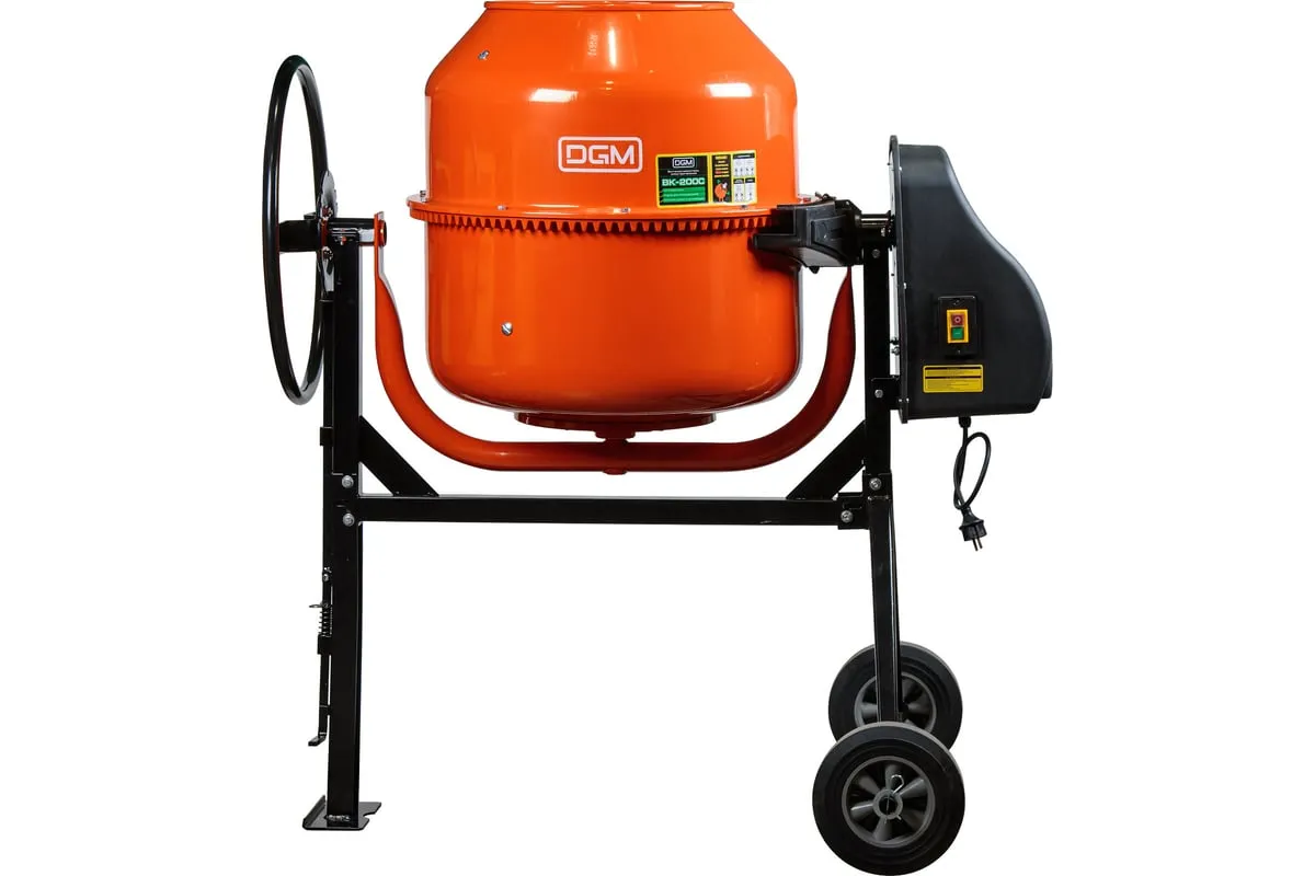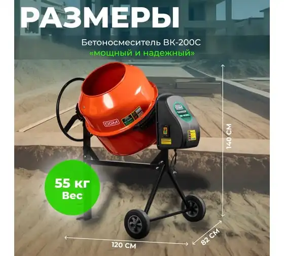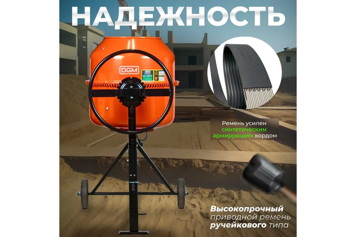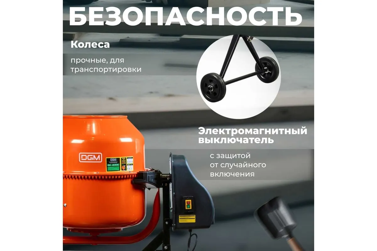 Опрокидывание барабана путем отклонения рулевого колеса. Защитный кожух на ведущей шестерне. Асинхронный двигатель с термозащитой. Болтовое соединение барабана к подшипнику. Чугунная ведущая шестерня. Чугунный зубчатый венец. Эффективное воздушное охлаждение двигателя. Высокопрочный приводной ремень ручейкового типа, усиленный синтетическим армирующим кордом.