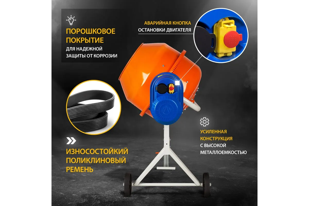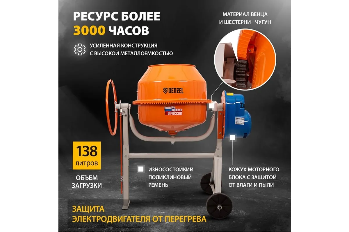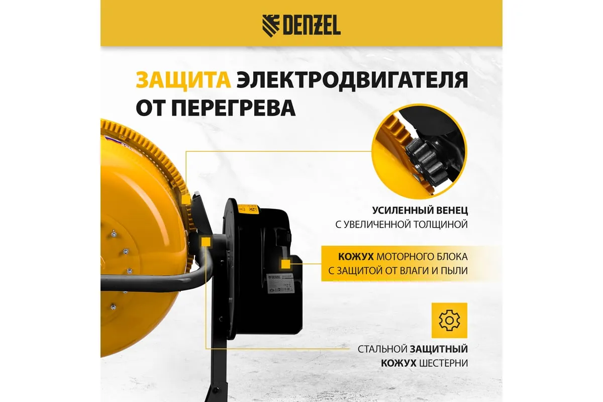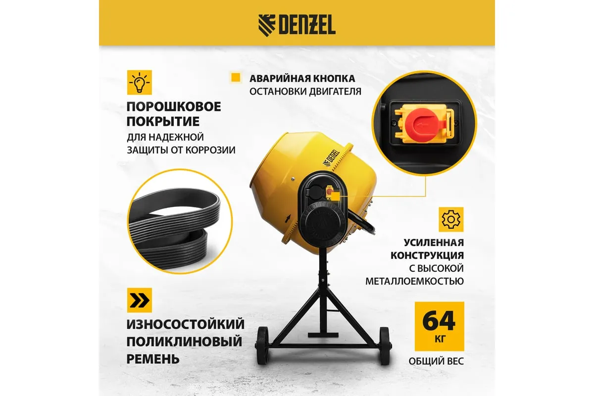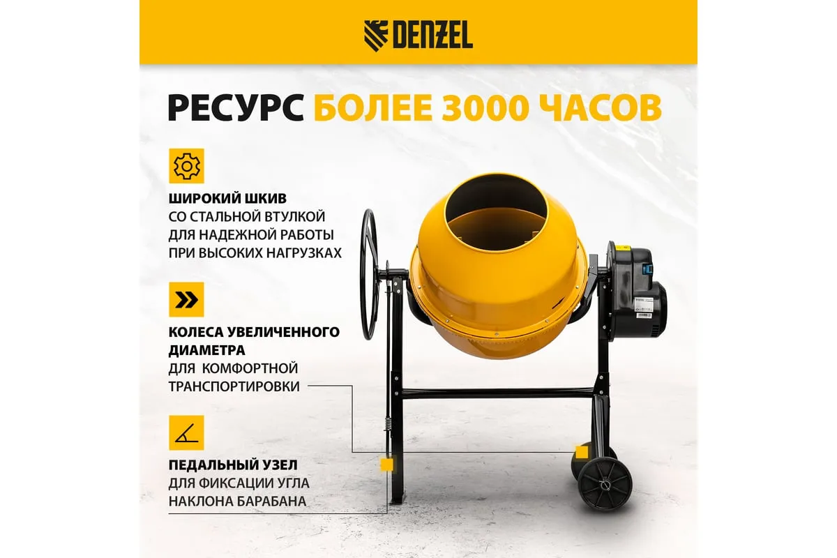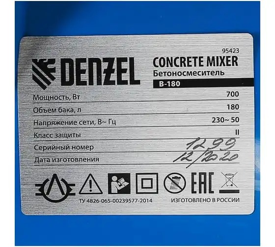 Бетоносмеситель Denzel B-180 95423 оснащается асинхронным двигателем мощностью 700 Вт. Модель успешно применяется в процессе изготовления разнообразных строительных смесей. Долгий срок службы агрегата обусловлен продуманной конструкцией ременного привода: поликлиновый ремень с полиэфирным кордом минимально контактирует со шкивами, которые расположены в одной плоскости. Для удобства оператора угол наклона емкости фиксируется одним нажатием на педаль. Двигатель имеет медную обмотку, которая позволяет ему стабильно работать в случае понижения напряжения.