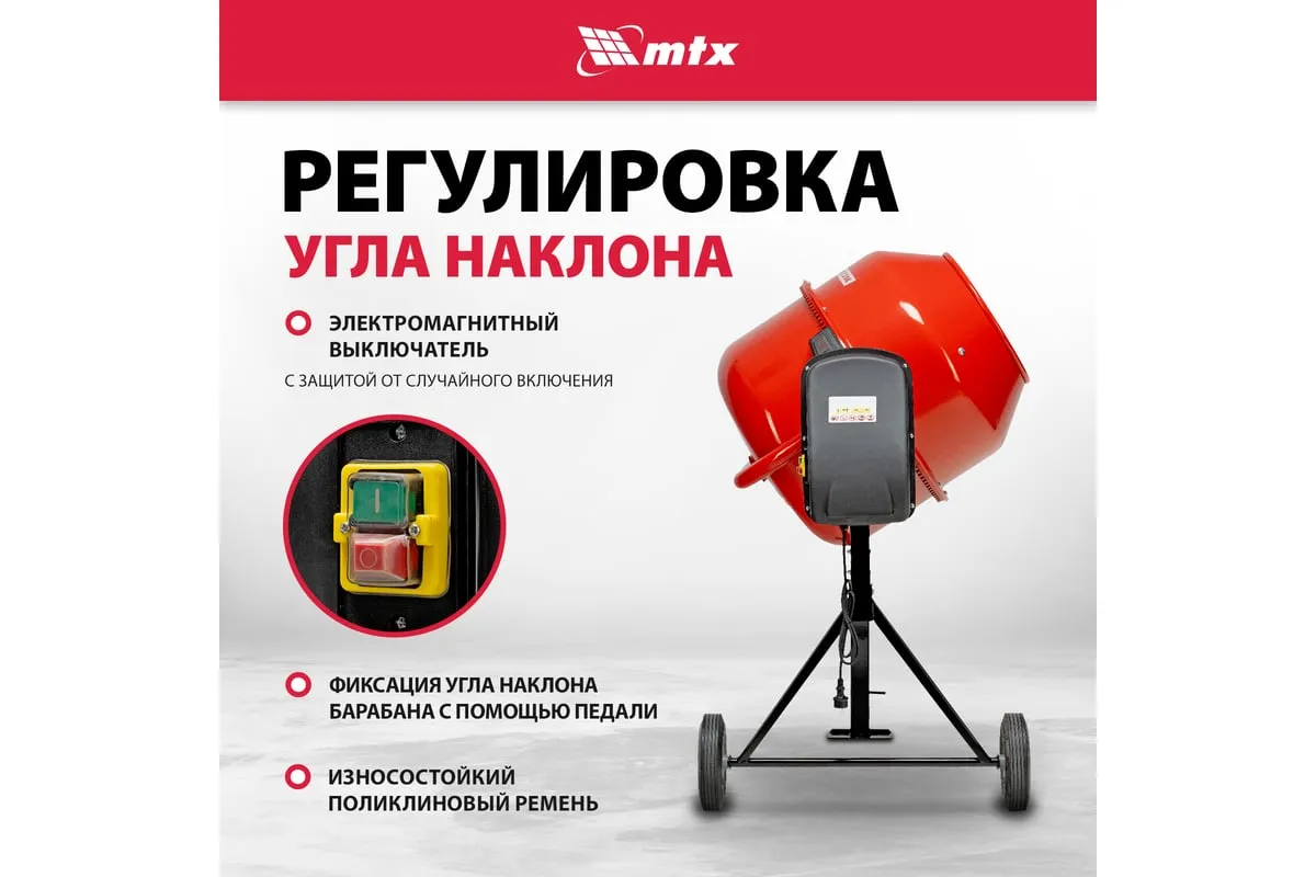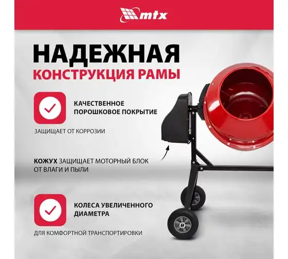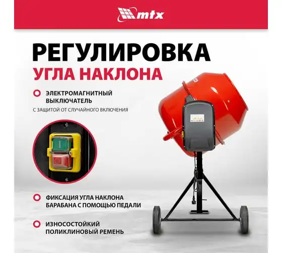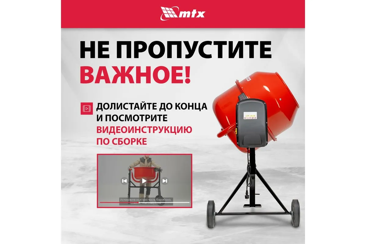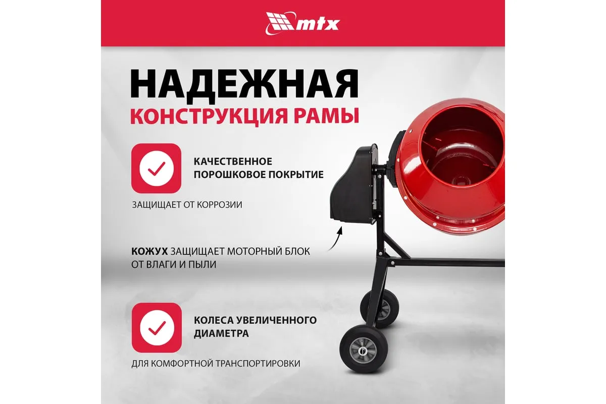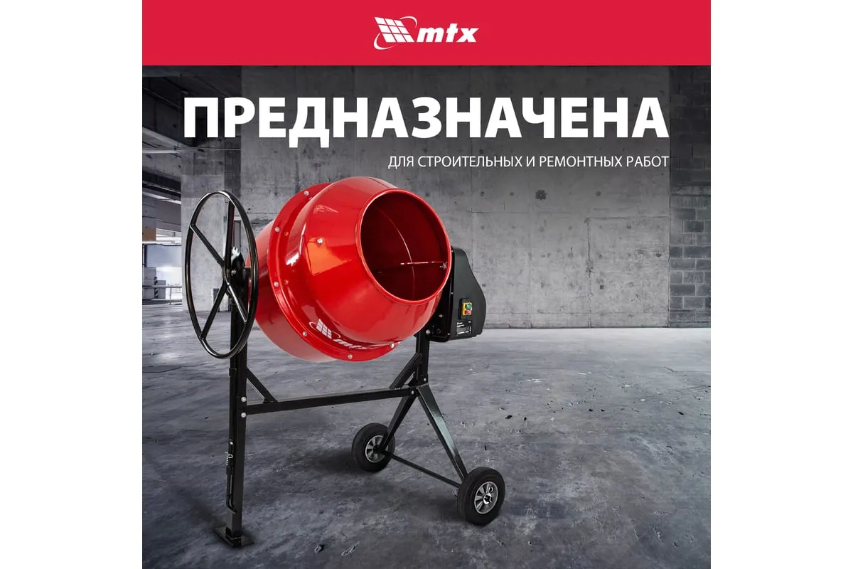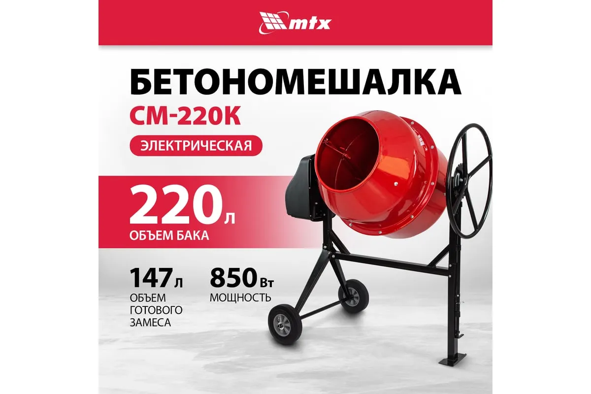 Бетоносмеситель MTX СМ-220К, 220 л, мощность 850 Вт 95486 применяется для замешивания до 147 литров строительного раствора за один цикл. Оборудование оснащается двигателем асинхронного типа.