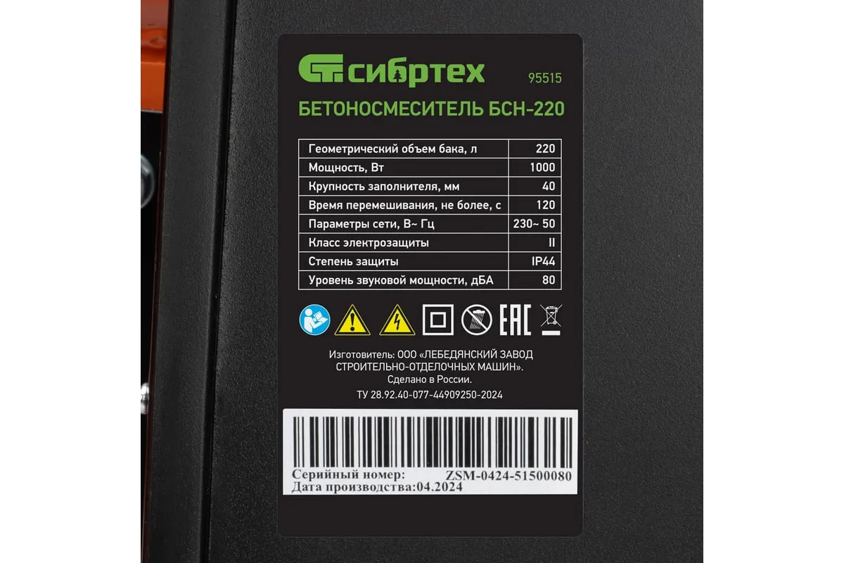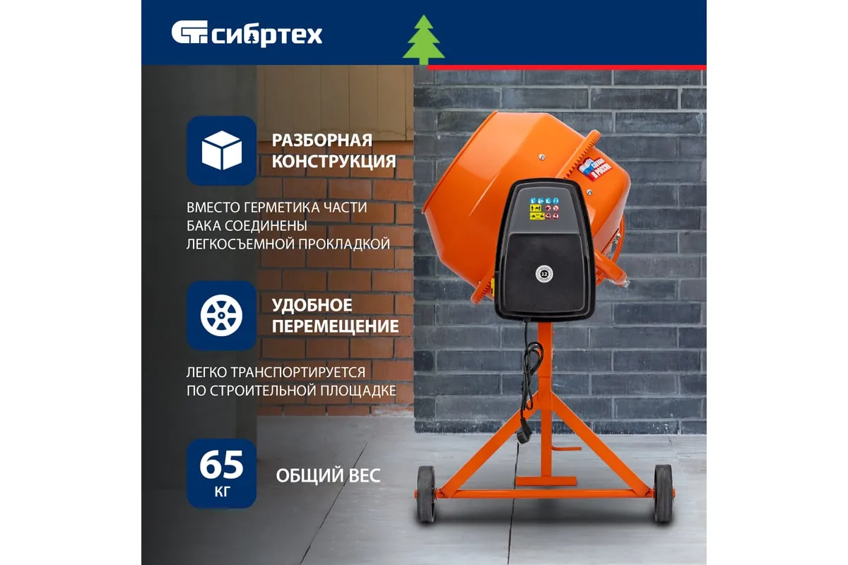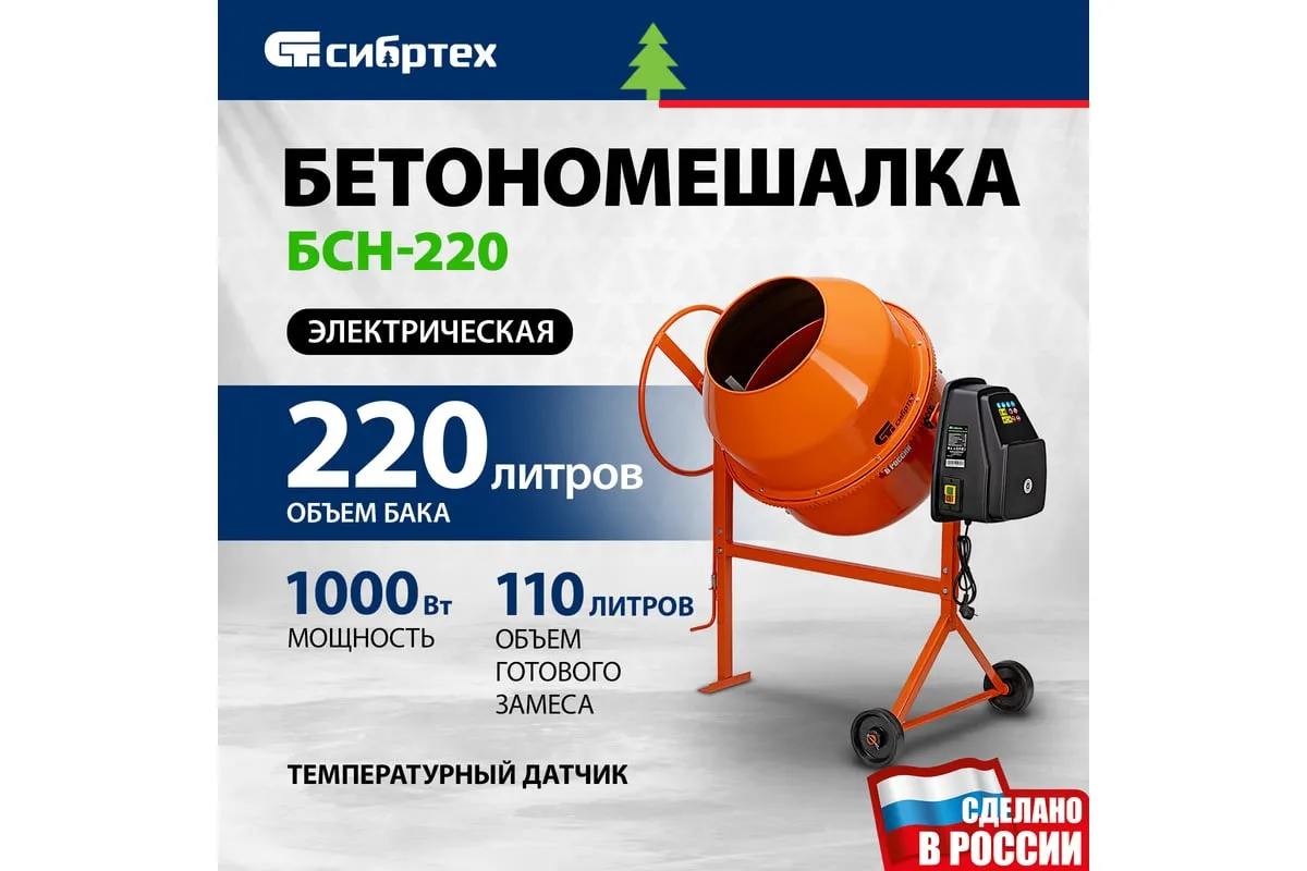 Бетоносмеситель Сибртех БСН-220 95515 мощностью 1000 Вт предназначен для приготовления бетонных смесей и штукатурных растворов. Допускается использование крупнозернистых заполнителей с фракциями размером до 40 мм. Объем бака составляет 220 л, за один замес можно получить до 110 л готовой смеси. Время замешивания не превышает 2 минут, что позволяет избежать длительных перерывов в работе. Бетоносмеситель пригодится для проведения строительных работ. Двигатель мощностью 1000 Вт обеспечивает высокую производительность, при этом не создает значительной нагрузки на электросеть. Бетоносмеситель пригодится для проведения строительных работ небольшого объема.