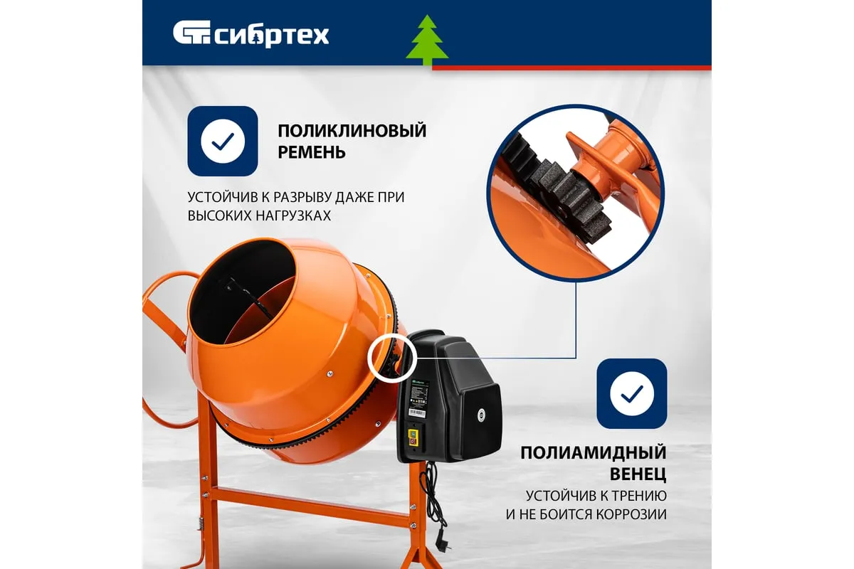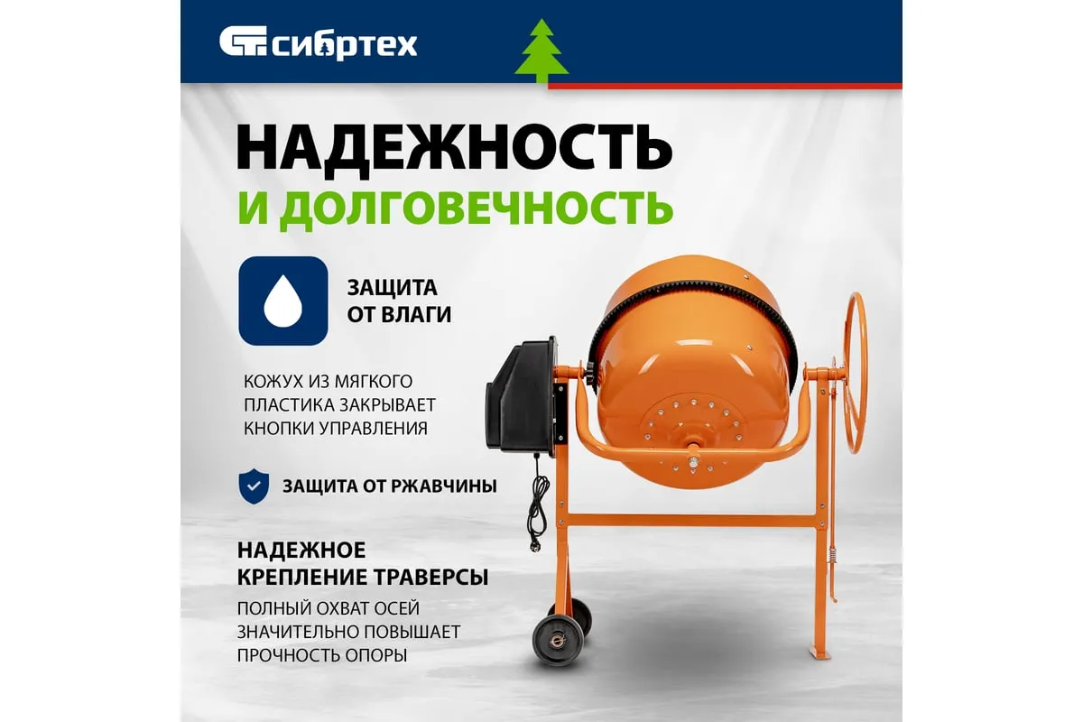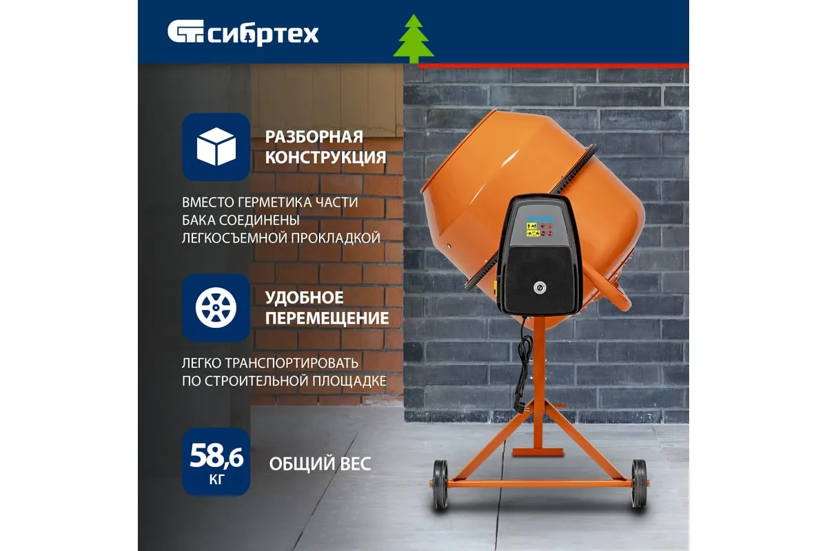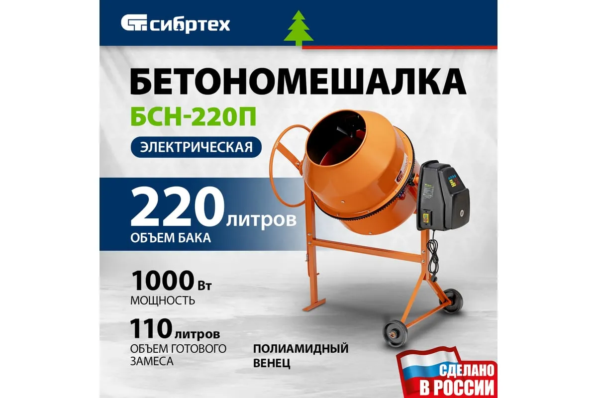 Бетоносмеситель Сибртех БСН-220П 95521 мощностью 1000 Вт предназначен для приготовления бетонных смесей и штукатурных растворов. Допускается использование крупнозернистых заполнителей с фракциями размером до 40 мм. Объем бака составляет 220 л, за один замес можно получить до 110 л готовой смеси. Время замешивания не превышает 2 минут, что позволяет избежать длительных перерывов в работе. Бетоносмеситель используется для проведения строительных работ небольшого объема. Двигатель мощностью 1000 Вт обеспечивает высокую производительность, при этом не создает значительной нагрузки на электросеть. Бетоносмеситель пригодится для проведения строительных работ небольшого объема.