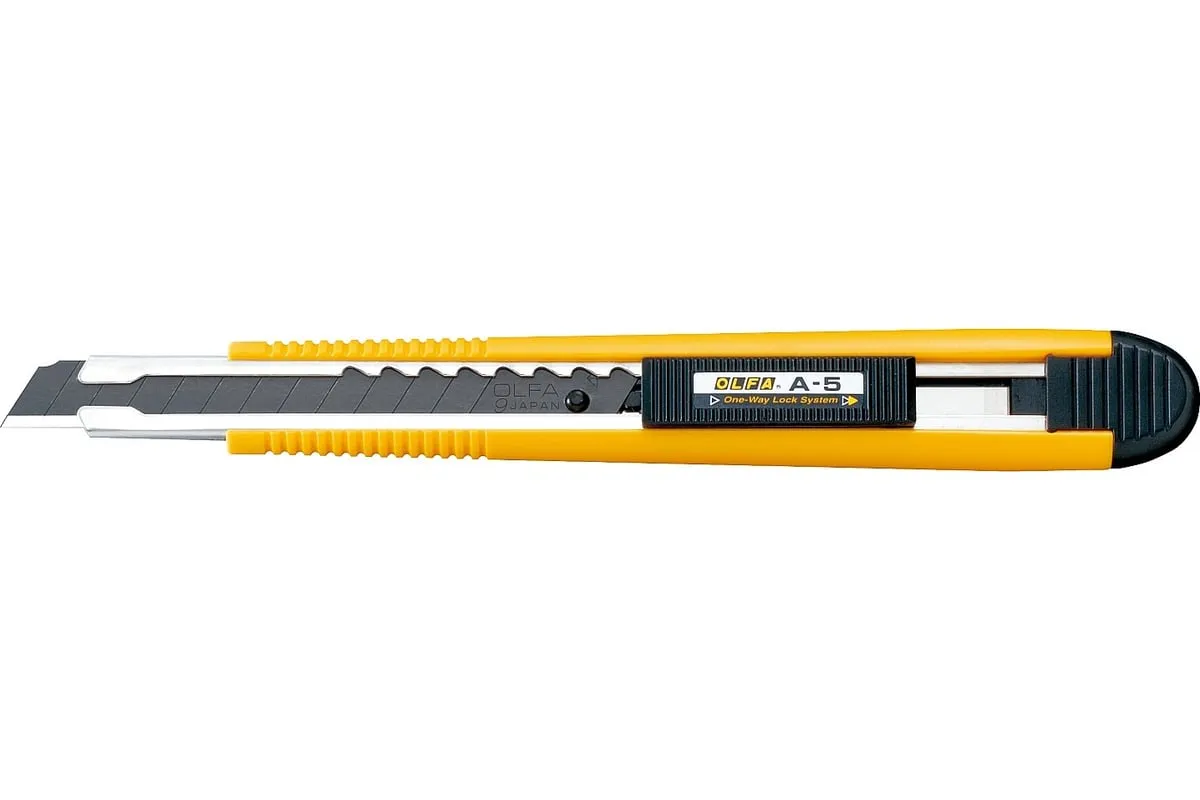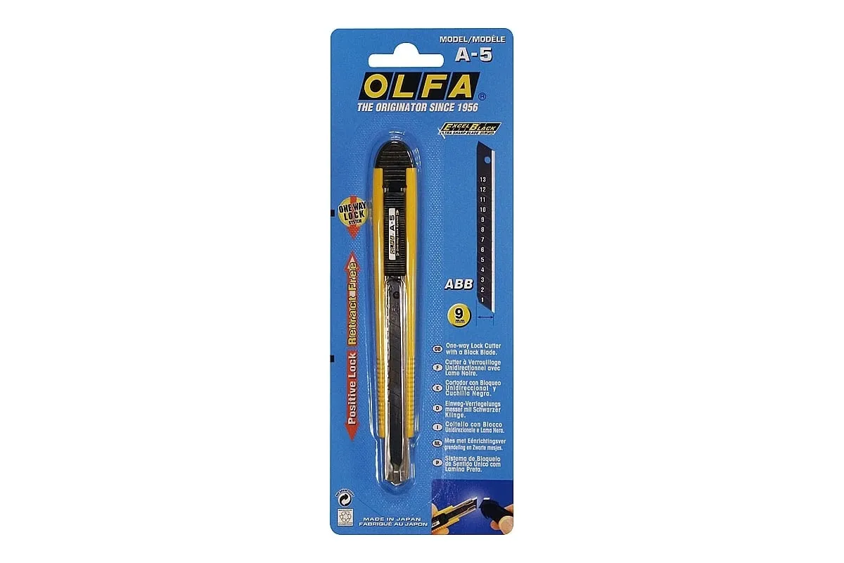 Благодаря односторонней системе запирания нож OLFA Autolock 9 мм OL-A-5 представляет собой усовершенствованную модель с автоблокировкой и сверхострым черным лезвием. Поставляется с черным лезвием шириной 9 мм, которое на 25% острее обычных лезвий OLFA. Состоит из тринадцати отламывающихся сегментов. Если нож затупился, просто отломите сегмент и продолжите работу.