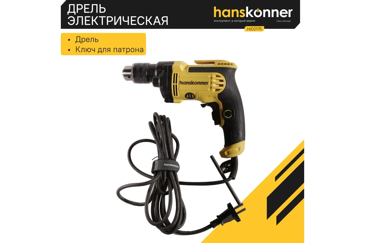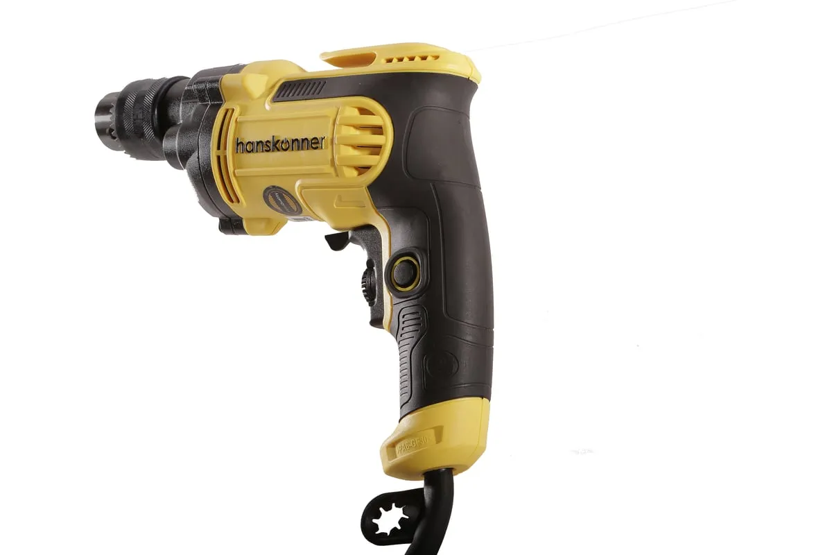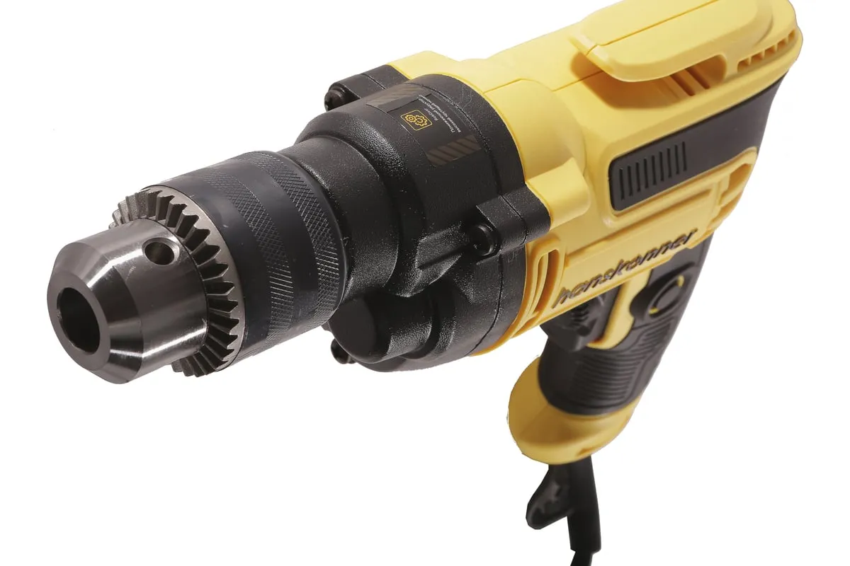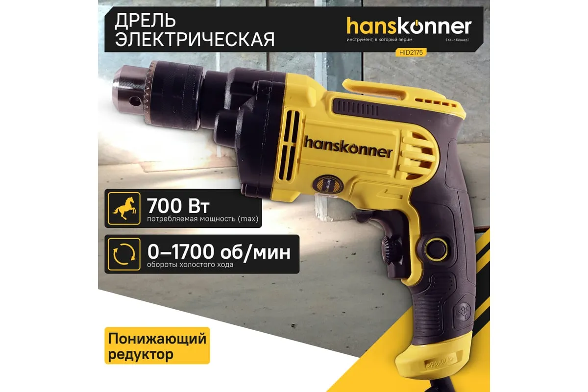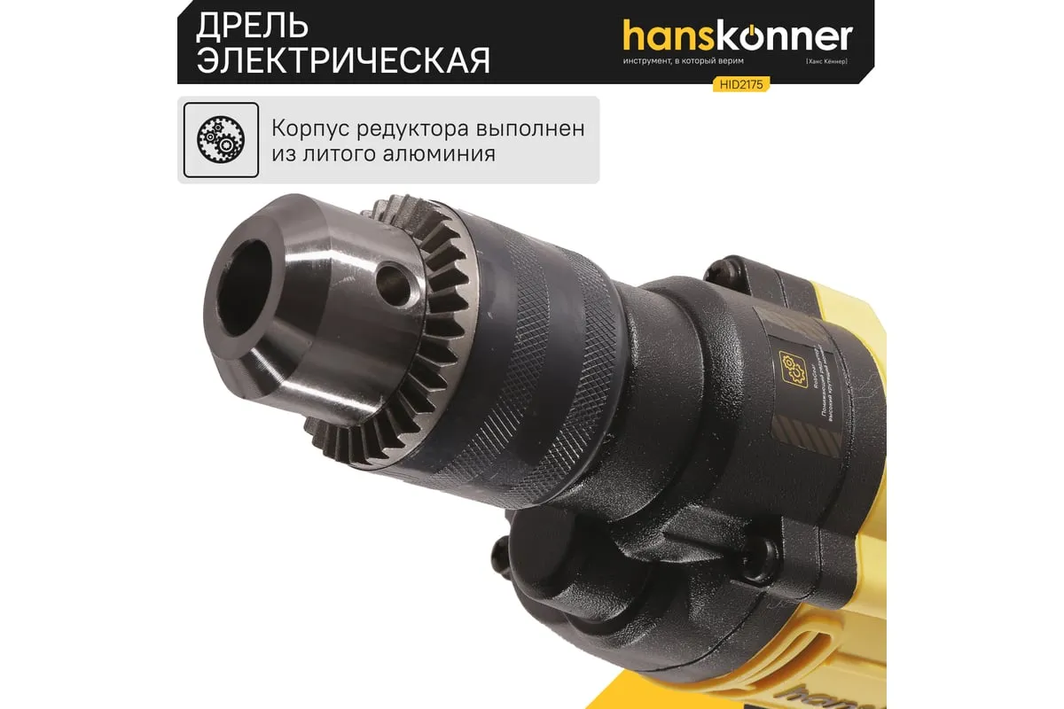 Безударная дрель Hanskonner HID2175 – компактный и мощный электроинструмент, с кулачковым патроном и надежной конструкцией для сверления отверстий в различных материалах: пластик, дерево, сталь. Данная модель оснащена понижающим редуктором, что позволяет легко просверливать отверстия большого диаметра, а также размешивать строительные смеси, при наличии специальной насадки. В интересах длительности эксплуатации используются фирменные подшипники увеличенного ресурса и металлический корпус редуктора, способствующий качественному теплоотводу. Безударная конструкция инструмента позволяет минимизировать люфты, отчего становится возможным максимально точное сверление. Удобству в обращении способствует фиксатор-липучка кабеля и блокировка выключателя во включенном положении при длительных работах. Морозостойкий резиновый сетевой кабель длинной 4 м, позволяет охватит рабочую зону площадью 50 м2.