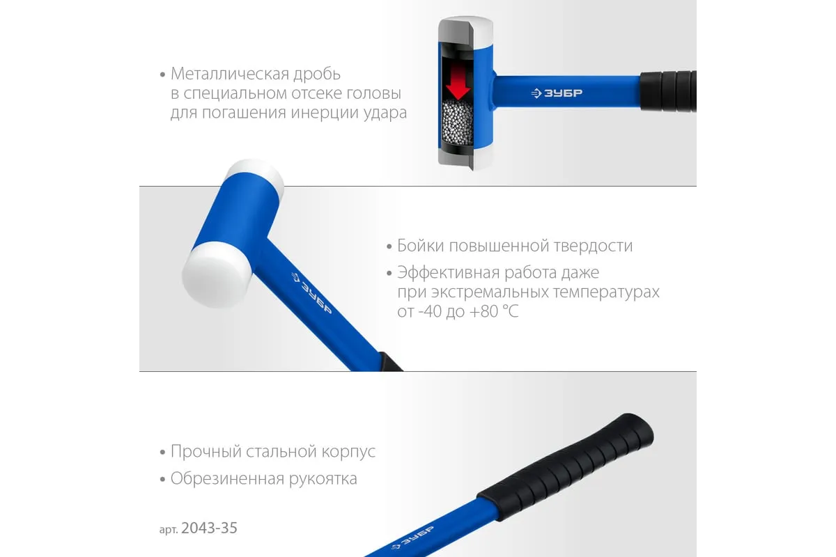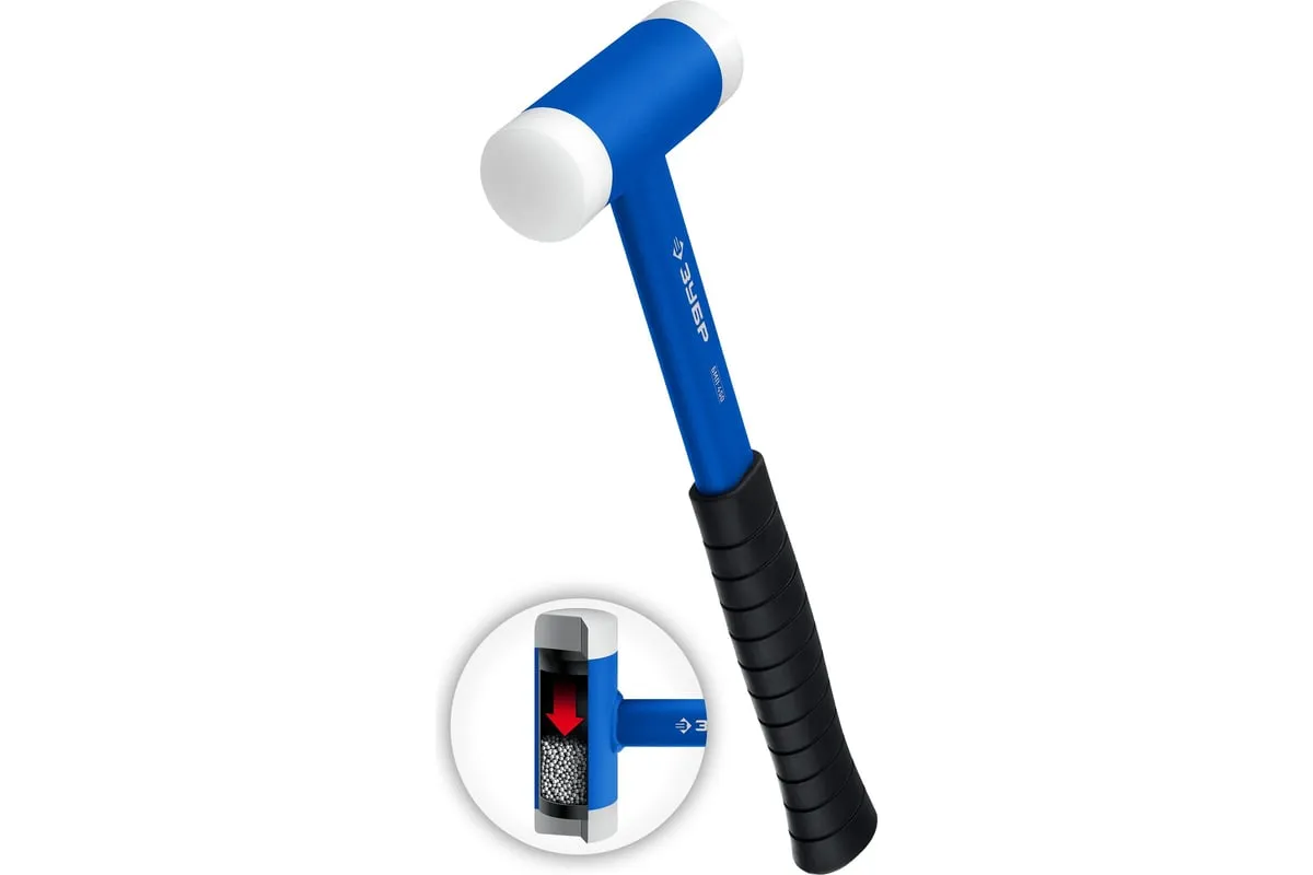 Безынерционный молоток идеально подходит для работ с материалами, чувствительными к ударам. Оснащен сменными бойками средней твердости, что позволяет работать с различными материалами не повреждая их. Инерция удара гасится благодаря применению специального металлического наполнителя. Металлическая обрезиненная рукоятка эргономичной формы обеспечивает надежный захват и комфортную работу. Применение: промышленное производство, ремонт оборудования, авторемонтные и кузовные работы. Вес головы: 450 г.