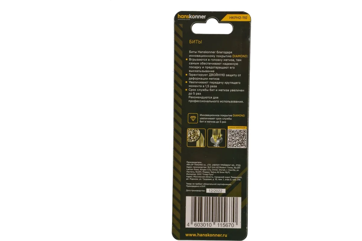 Бита PH2х110 мм Hanskonner HKPH2-110 благодаря инновационному покрытию DIAMOND вгрызается в головку метиза, тем самым обеспечивает надежную посадку и предотвращает его выскальзывание. Гарантирует двойную защиту от деформации метиза, увеличивает передачу крутящего момента в 1,5 раза.