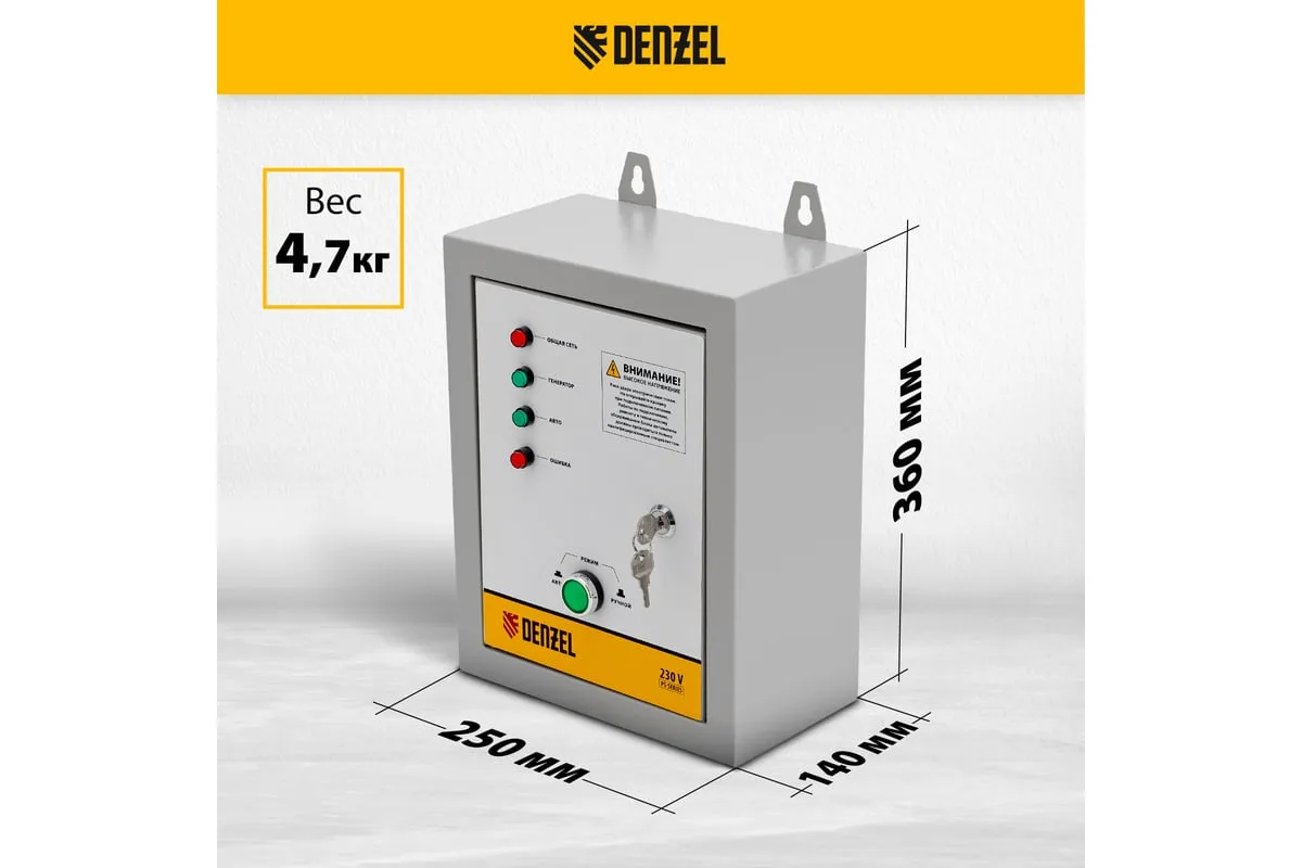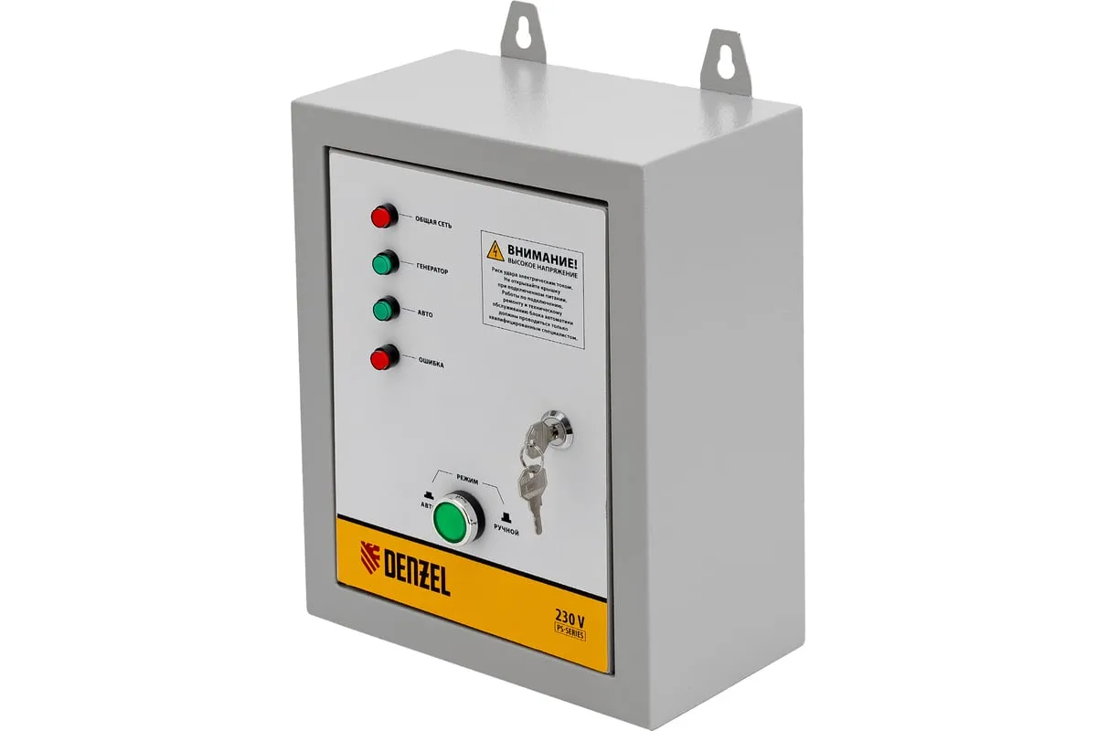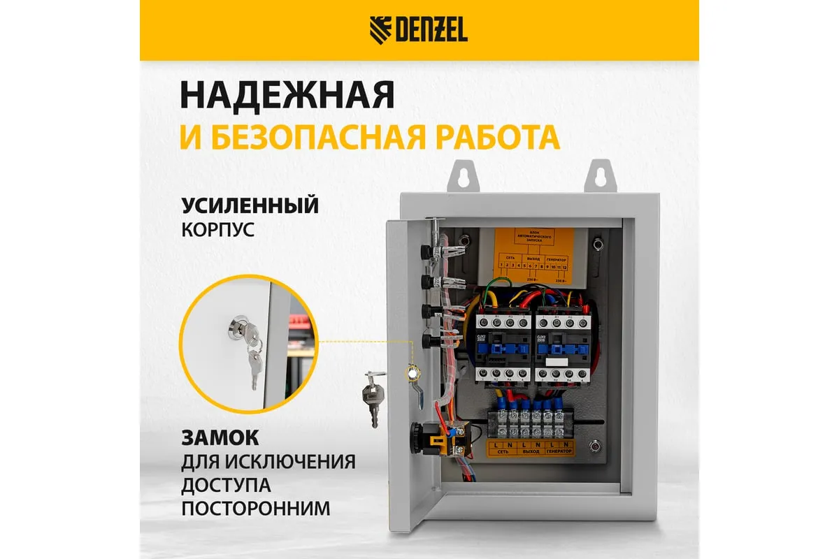Блок автоматического запуска Denzel ENERGOMATIC PS 115 946714 включает генератор при прекращении подачи электроэнергии в частных домах, дачных коттеджах, на небольших предприятиях и строительных объектах. Как только напряжение бытовой сети стабилизируется, блок АВР отключается. Подходит к генераторным установкам Denzel PS 55 EA, PS 70 EA, PS 80 EA и PS 90 EA. Максимальная мощность составляет 10 кВт.