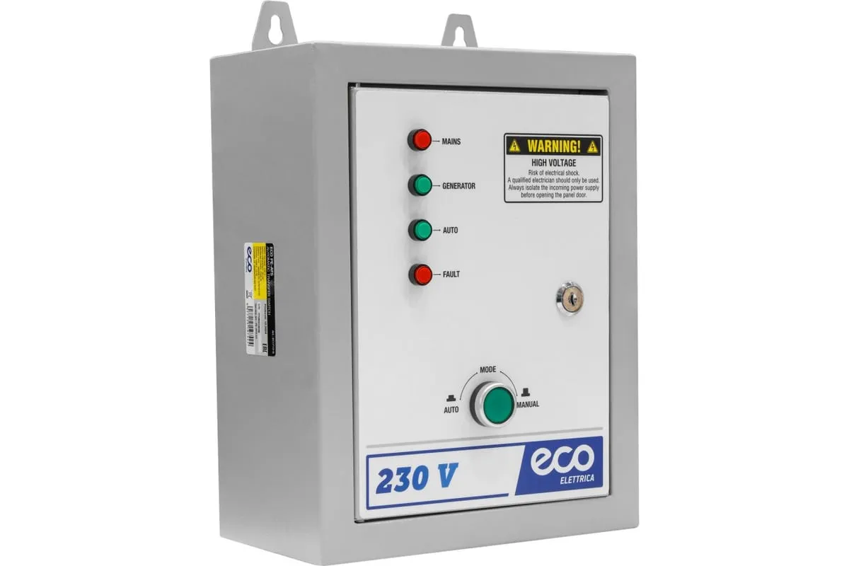 Блок автоматического включения для электростанции ЕСО PE-9001ES, ECO PE-7000ESI, ECO PE-10000ESI Панель автоматического включения представляет собой электронное устройство управления запуском электростанции. В случаях, когда напряжение в сети ниже допустимого уровня или отсутствует, контроллер в течение 2-6 секунд автоматически запускает электростанцию, которая продолжает подачу электропитания на энергопотребители. Когда подача питания от внешней сети возобновляется, контроллер останавливает электростанцию и переключает энергопотребители на питание от внешней сети. Совместим с генераторами, имеющими на панели управления разъем 8-pin для подключения блока ATS ЕСО PE-9001ES, ECO PE-7000ESI, ECO PE-10000ESI, ЕСО PE 6500ES, ЕСО PE 6500ESA, Patriot GP 6510AE, GP7210AE, GP8210AE и др.