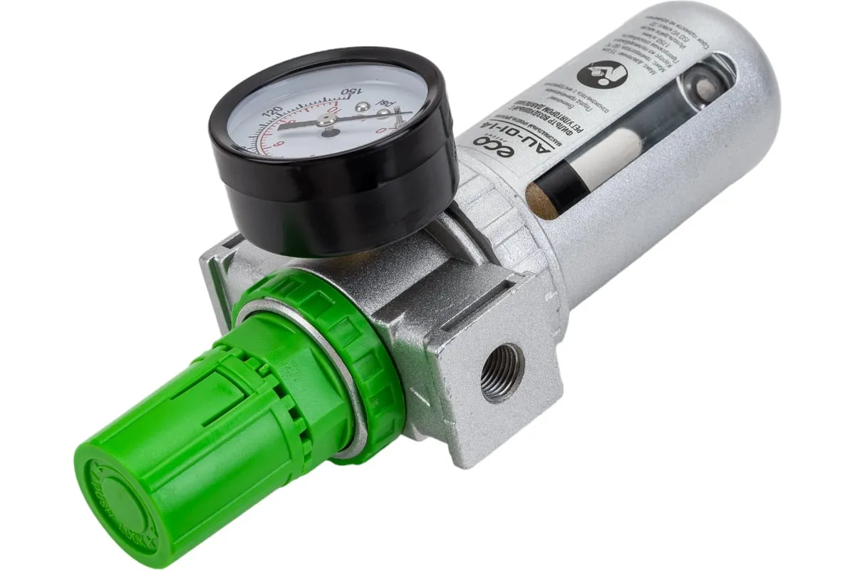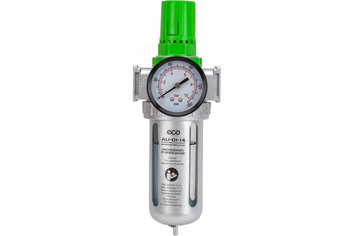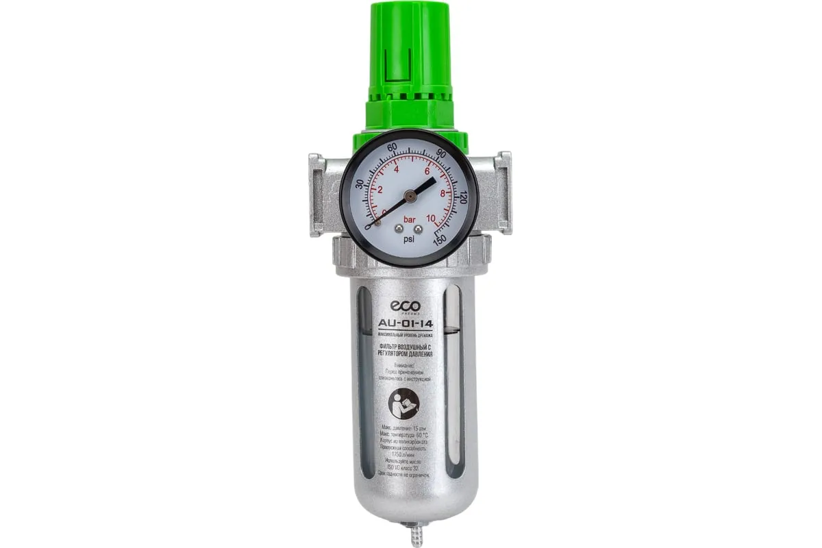 Блок подготовки воздуха 1/4" ECO AU-01-14 рекомендуется использовать для очистки воздуха от пыли и влаги при выполнении лакокрасочных работ с целью повышения качества окрашиваемой поверхности – отсутствие пузырей и шагрени, а также для повышения ресурса краскораспылителей. Регулятор предотвращает скачки давления в случае перебоя электропитания и при неисправностях оборудования.