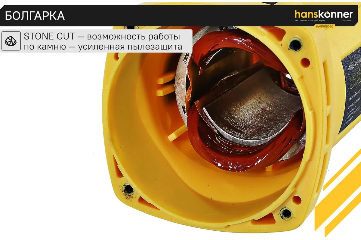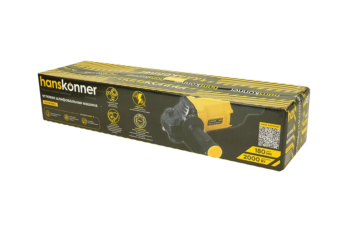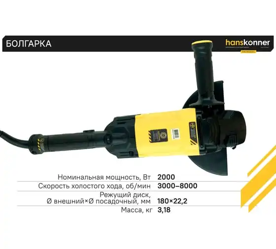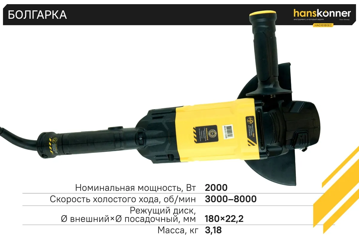Болгарка Hanskonner HAG16180EC — мощный и удобный электроинструмент для шлифования и зачистки поверхностей, а также резки металлов, кирпича, керамики или камня без использования воды. Данная модель будет отличным выбором для реза габаритного металла толщиной стенки до 3 мм. Подготовка инструмента к определенной операции и материалу, облегчается возможностью регулировки скорости вращения режущего диска. Модель оснащена функцией поддержки оборотов под нагрузкой и плавным пуском, что увеличивает надёжность инструмента, а также делает работу с инструментом максимально комфортной. В целях надежного и длительного использования ротор и статор, данной модели, дополнительно залиты лаком, что существенно повышает пылезащиту. Инструмент оборудован электродвигателем номинальной мощностью 2000 Вт для выполнения сложных задач, в том числе резки камня. Механизмы машины обеспечены фирменными подшипниками увеличенного ресурса. Морозостойкий резиновый сетевой кабель длинной 4 м способствуют комфорту при длительной работе.