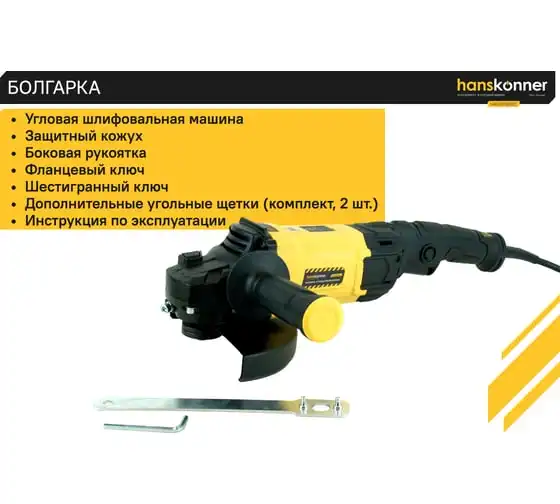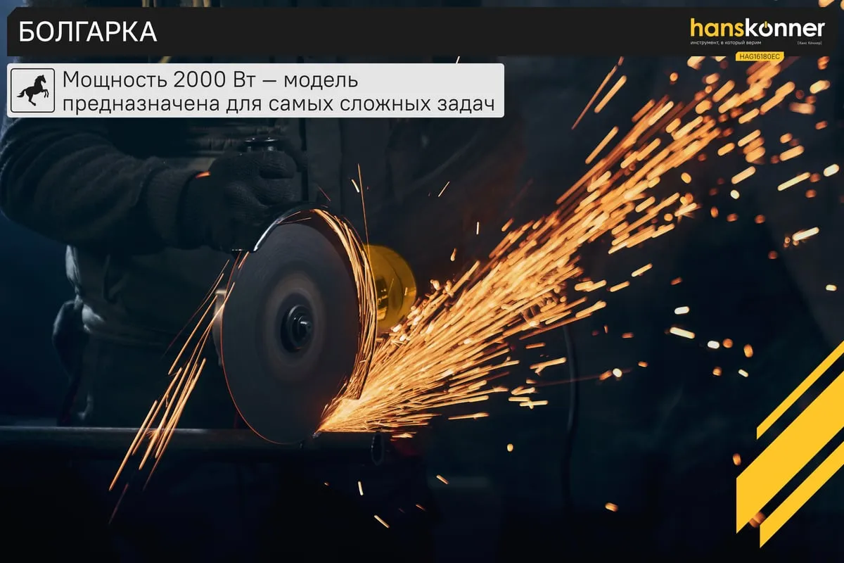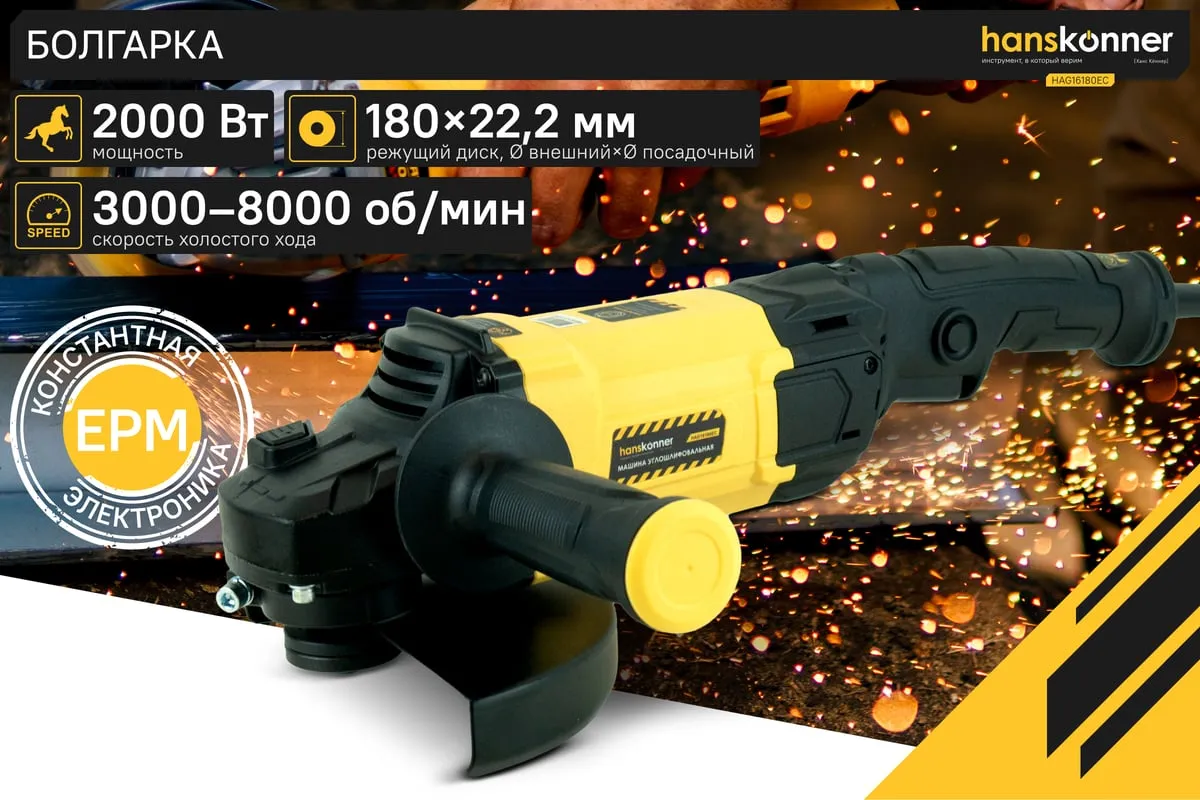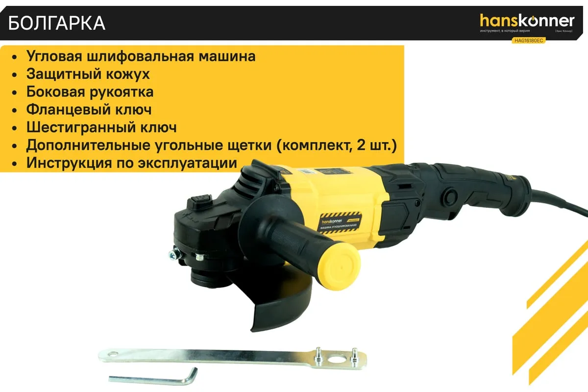 Болгарка Hanskonner HAG16180EC — мощный и удобный электроинструмент для шлифования и зачистки поверхностей, а также резки металлов, кирпича, керамики или камня без использования воды. Данная модель будет отличным выбором для реза габаритного металла толщиной стенки до 3 мм. Подготовка инструмента к определенной операции и материалу, облегчается возможностью регулировки скорости вращения режущего диска. Модель оснащена функцией поддержки оборотов под нагрузкой и плавным пуском, что увеличивает надёжность инструмента, а также делает работу с инструментом максимально комфортной. В целях надежного и длительного использования ротор и статор, данной модели, дополнительно залиты лаком, что существенно повышает пылезащиту. Инструмент оборудован электродвигателем номинальной мощностью 2000 Вт для выполнения сложных задач, в том числе резки камня. Механизмы машины обеспечены фирменными подшипниками увеличенного ресурса. Морозостойкий резиновый сетевой кабель длинной 4 м способствуют комфорту при длительной работе.