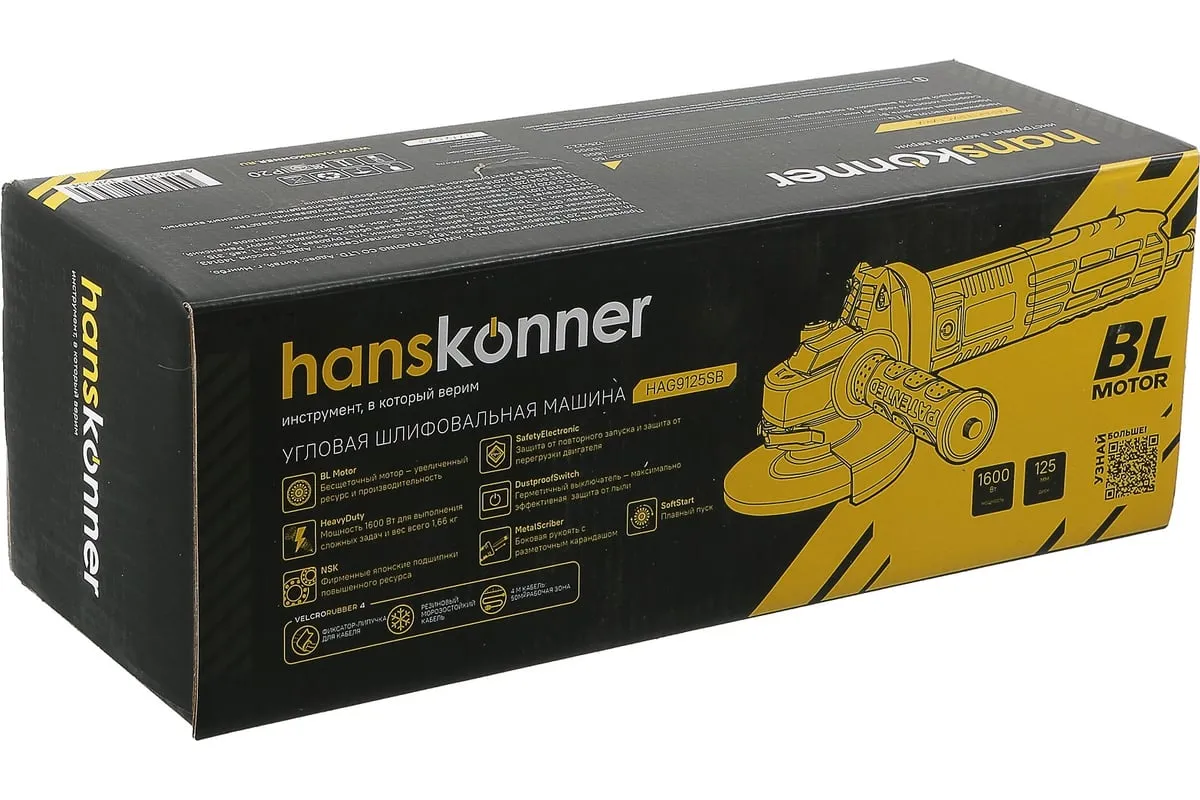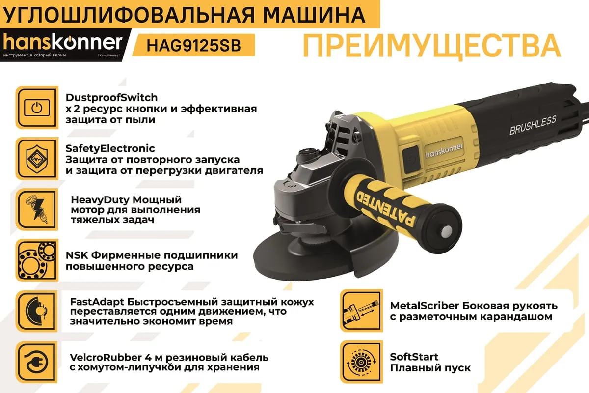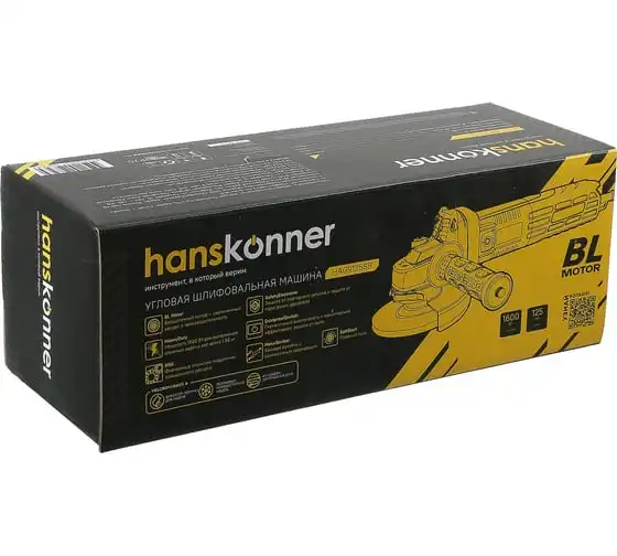 Угловая шлифовальная машина Hanskonner HAG9125SB — мощный и компактный электроинструмент для шлифования и зачистки поверхностей, а также резки металлов, кирпича, керамики или камня без использования воды. Данная модель имеет бесщеточный электродвигатель мощностью 1600 Вт и фирменные японские подшипники NSK, что повышает продуктивность и рабочий ресурс. Также, ресурс инструмента, подкреплен герметичным выключателем, функцией плавного пуска и защитой от перегрузки двигателя. Защитный кожух диска с мгновенной регулировкой положения, при помощи сопутного рычажка, дополняет легкость в обращении с ушм. Практичность модели подчеркнута твердосплавным разметочным карандашом, размещенным в боковой рукояти. Безопасному ходу эксплуатации благоприятствует защита от повторного запуска. Морозостойкий резиновый сетевой кабель длинной 4 м, позволяет охватит рабочую зону площадью 50 м2.