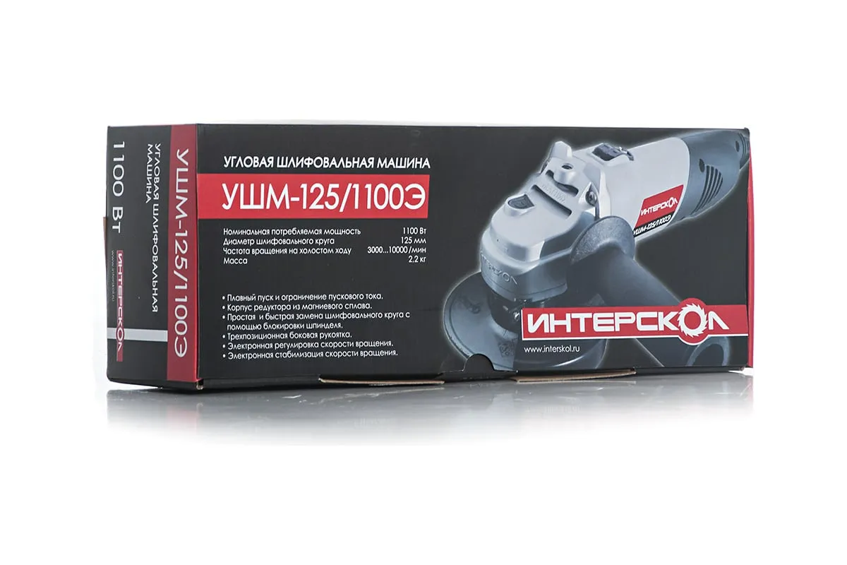 Угловая шлифмашина Интерскол УШМ-125/1100 Э предназначена для зачистки, шлифовки и резки древесины, металла или кирпича. Инструмент мощностью 1100 Вт имеет компактные габариты и вес 2.2 кг. Имеет такие функции, как: регулятор оборотов, блокировка шпинделя и ограничение пускового тока.