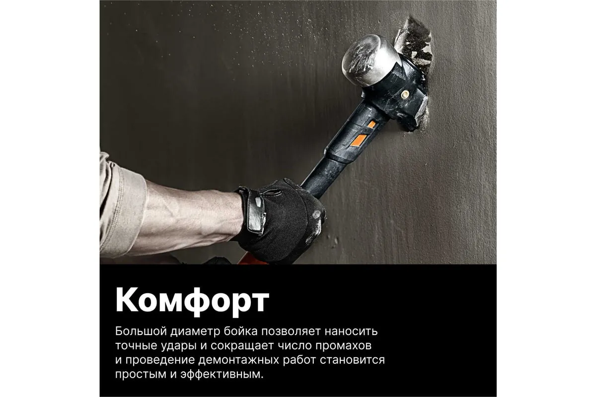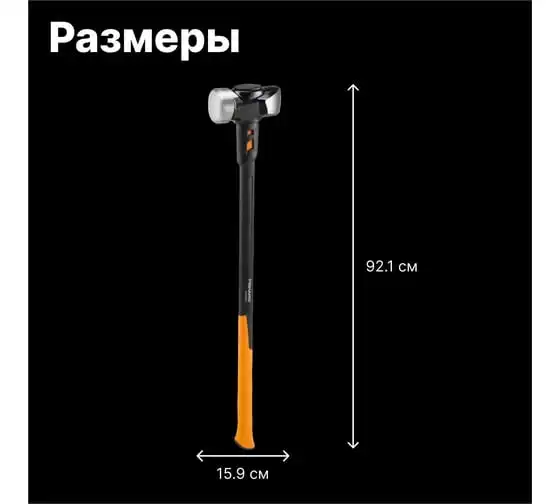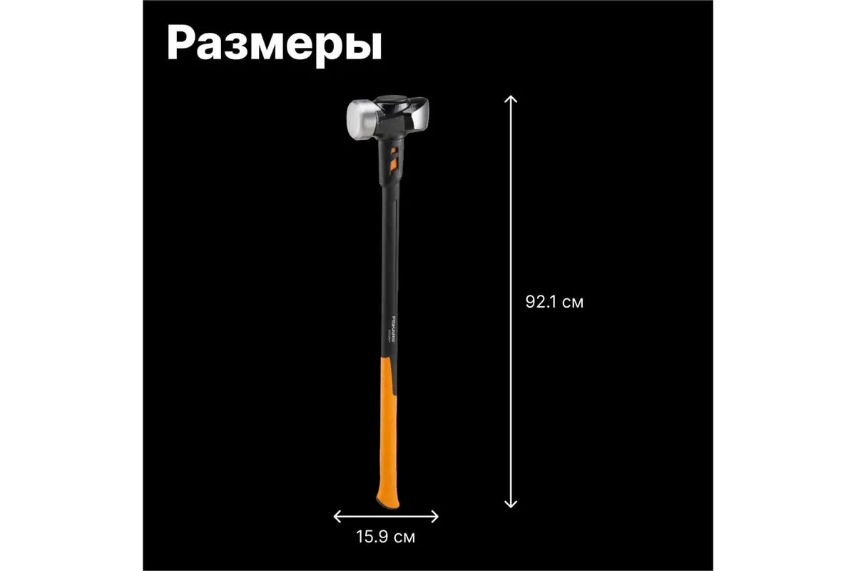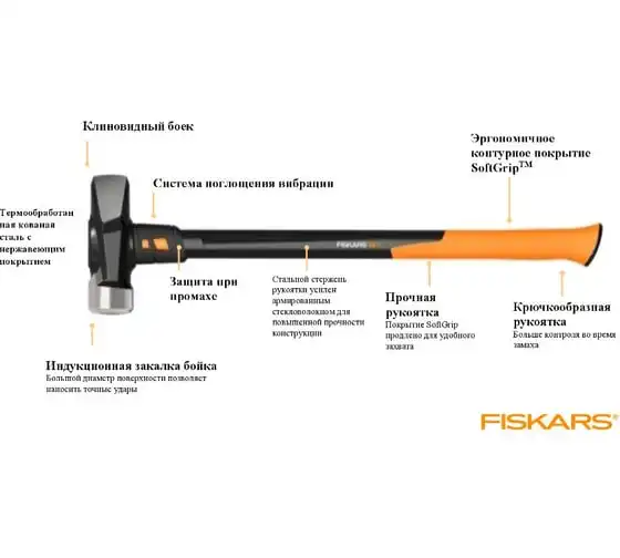 Большая кувалда Fiskars 8 lb/36" 1020219 оснащен клиновидным бойком, который изготовлен из кованой стали и прошел термическую обработку, а еще имеет нержавеющее покрытие. Прочность конструкции также поддерживает еще одна особенность - стальной стержень рукоятки усилен армированным стекловолокном. Всё это способствует долгому сроку службы инструмента. Покрытие SoftGrip препятствует скольжению руки во время работы. Предусмотрена антивибрационная система, что делает рабочий процесс более комфортным. Модель имеет защиту при промахе.