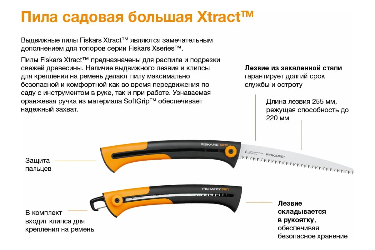 Большая садовая пила Xtract Fiskars SW 75 1000614 (123880) идеальна как для различных плотницких работ, так и для работ в саду. Она одинаково хорошо справляется с распилом досок и реек, а также с сучьями и ветками. Удобная, приятная на ощупь рукоять из полиамида исключает возможность получения травмы во время работы. Складная конструкция существенно продлевает срок службы лезвия, ведь внутри рукояти ему просто не обо что затупиться. Размер и вес делают пилу нетребовательной к хранению и транспортировке.