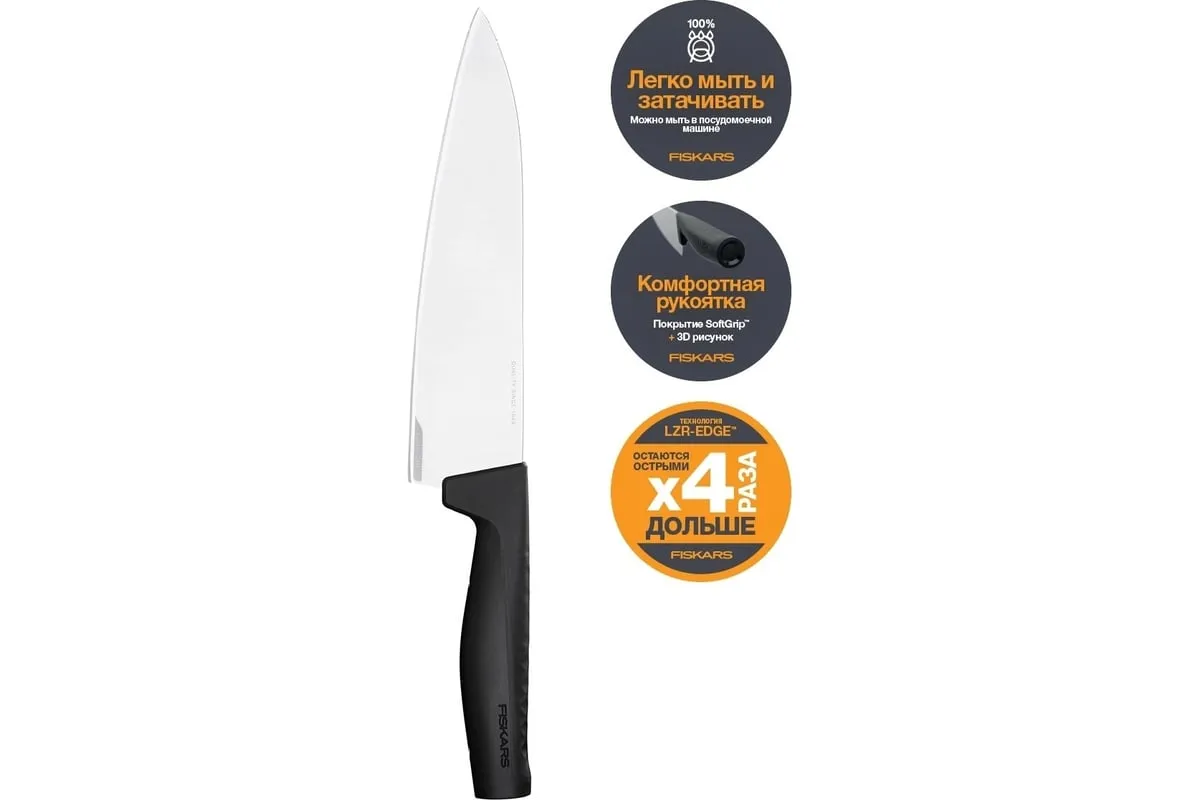 Большой поварской нож Fiskars Hard Edge 1051747 удобен для резки любых продуктов на кухне. Модель оптимальна по размерам для больших кусков мяса или порции овощей.
