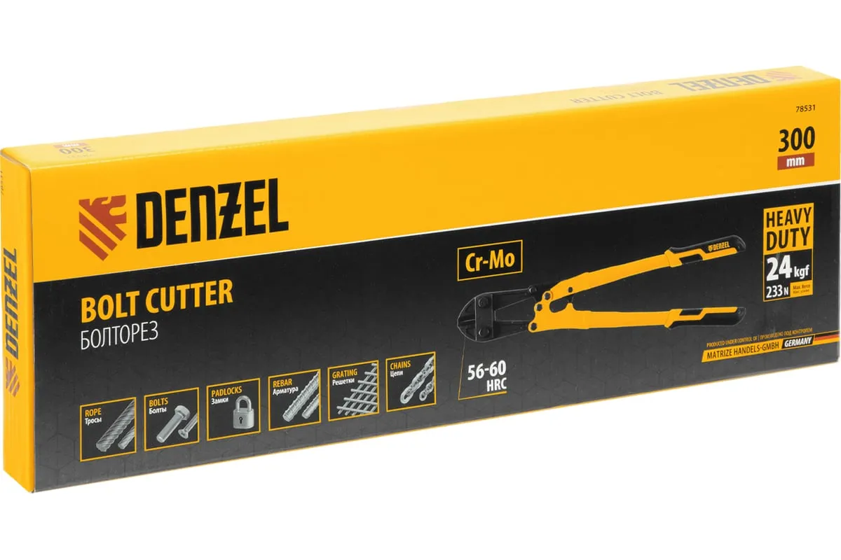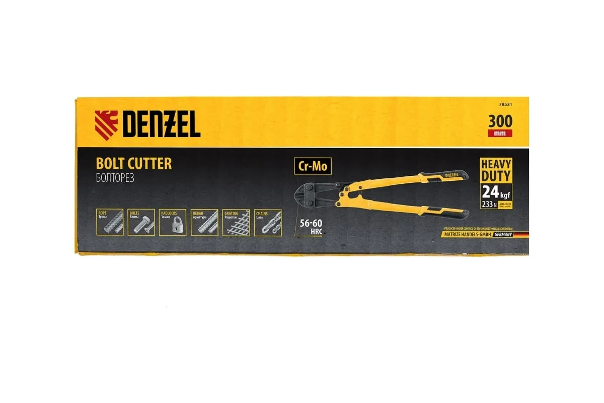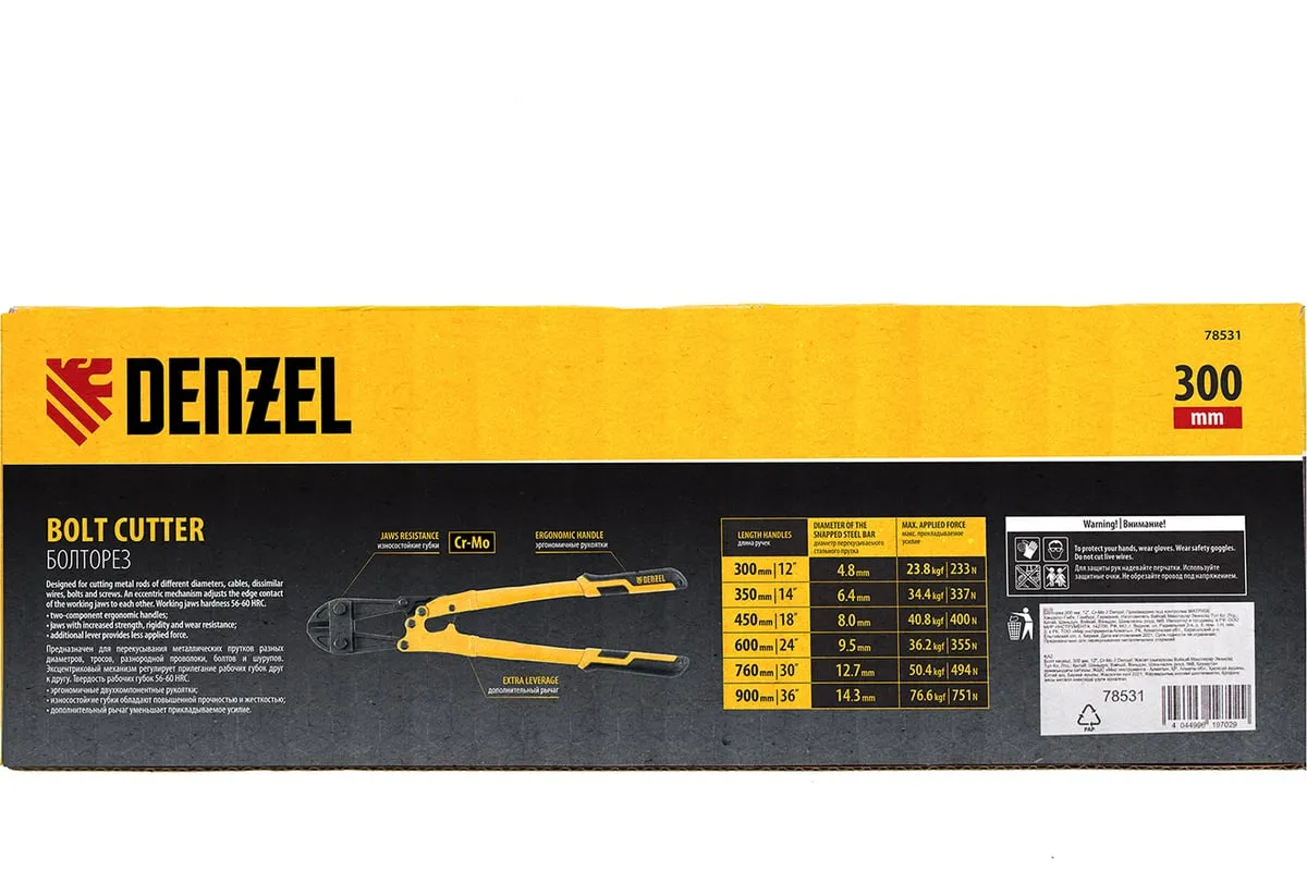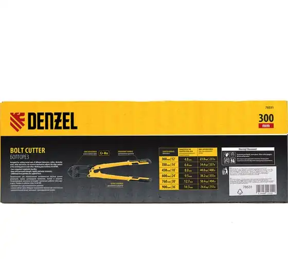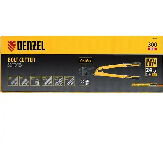 Болторез Denzel 300 мм, 12", Cr-Mo 78531 предназначен для перекусывания стальных прутков диаметром 4,8 мм, болтов и шурупов, тросов, разнородной проволоки. Рабочая часть инструмента выполнена из качественной хромомолибденовой стали, что обеспечивает высокую прочность и долговечность. Покрытие порошковой эмалью увеличивает эксплуатационный ресурс инструмента и защищает рабочую часть от коррозии. Эргономичные двухкомпонентные рукоятки обеспечивают комфортную эксплуатацию и не скользят в руках при работе.