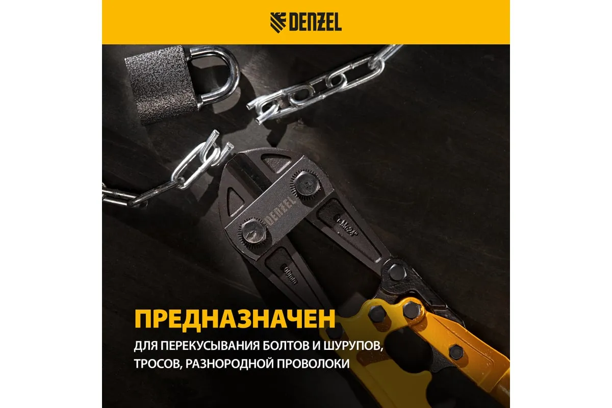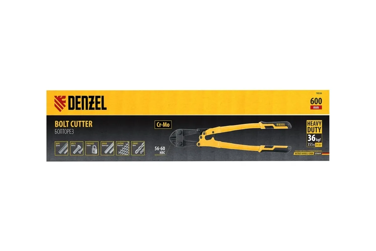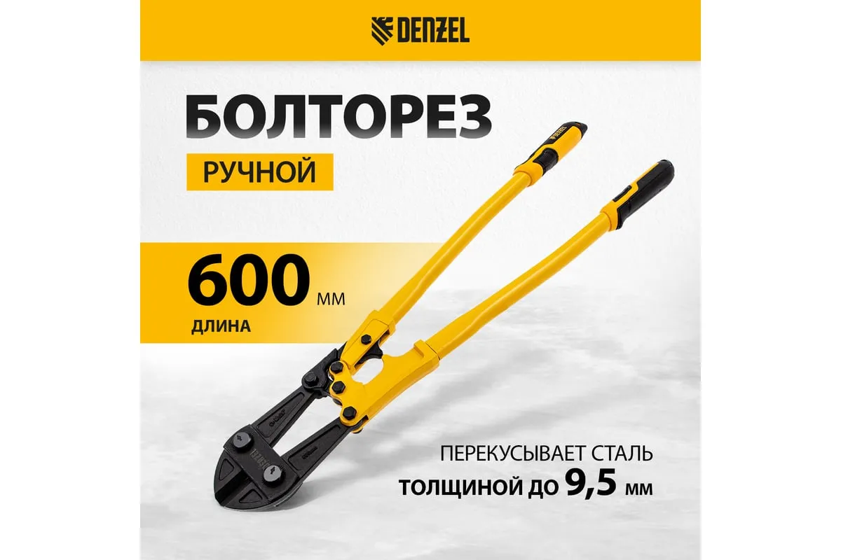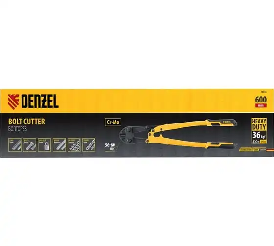 Болторез Denzel 600 мм, 24", Cr-Mo 78536 предназначен для перекусывания стальных прутков диаметром 9.5 мм, болтов и шурупов, тросов, разнородной проволоки. Рабочая часть инструмента выполнена из качественной хромомолибденовой стали, что обеспечивает высокую прочность и долговечность. Покрытие порошковой эмалью увеличивает эксплуатационный ресурс инструмента и защищает рабочую часть от коррозии. Эргономичные двухкомпонентные рукоятки обеспечивают комфортную эксплуатацию и не скользят в руках при работе.