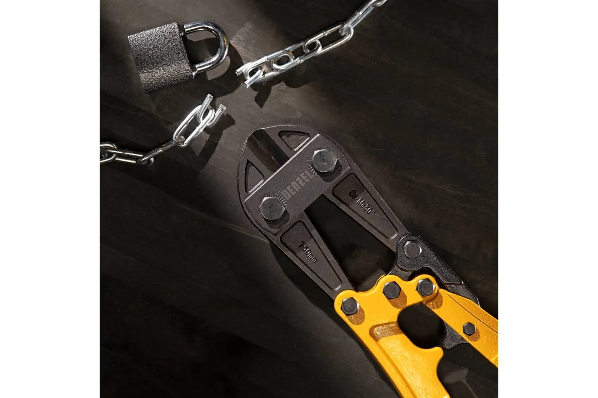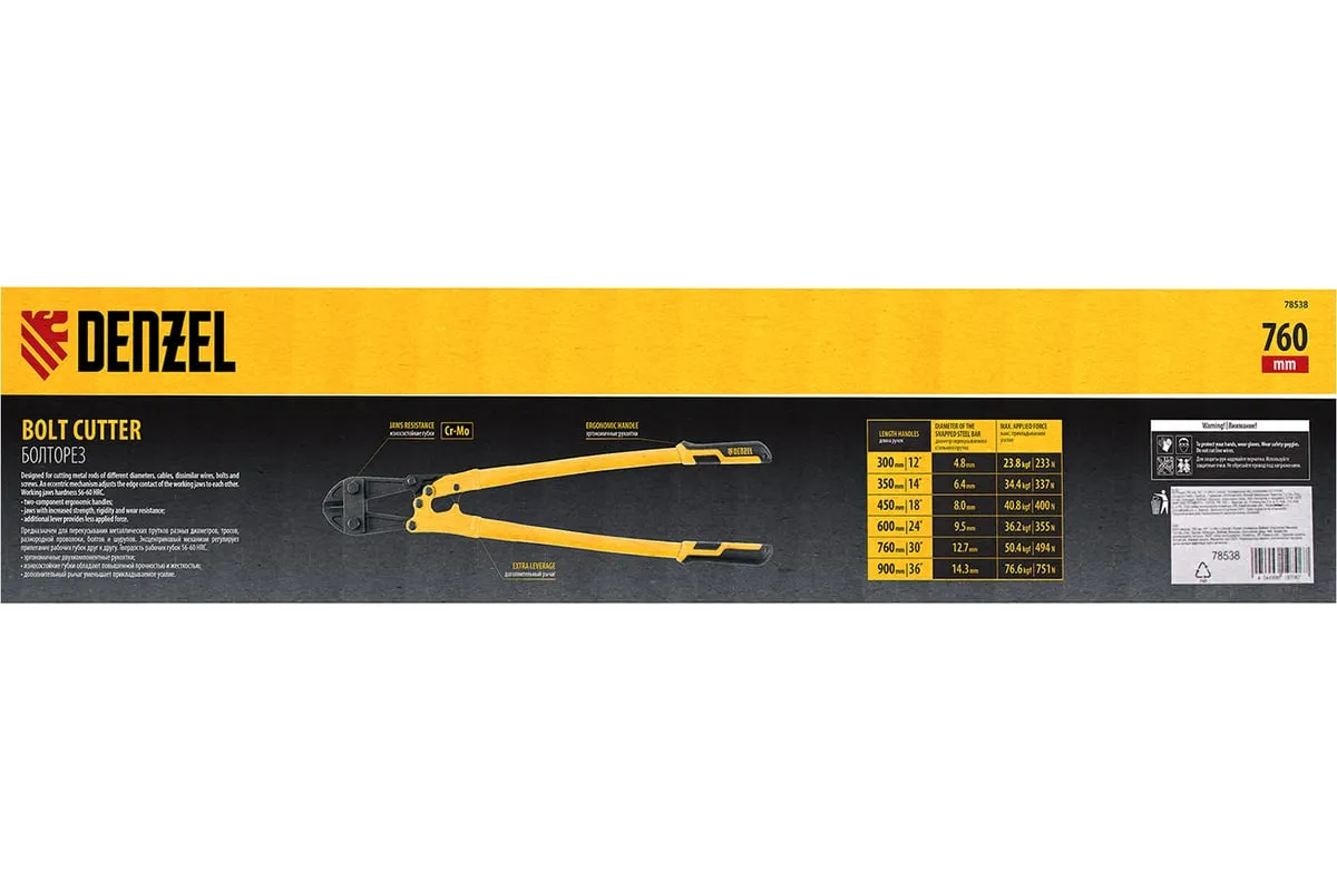 Болторез Denzel 760 мм, 30", Cr-Mo 78538 предназначен для перекусывания стальных прутков диаметром 12.7 мм, болтов и шурупов, тросов, разнородной проволоки. Рабочая часть инструмента выполнена из качественной хромомолибденовой стали, что обеспечивает высокую прочность и долговечность. Покрытие порошковой эмалью увеличивает эксплуатационный ресурс инструмента и защищает рабочую часть от коррозии. Эргономичные двухкомпонентные рукоятки обеспечивают комфортную эксплуатацию и не скользят в руках при работе.