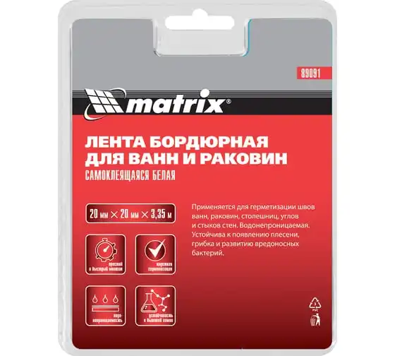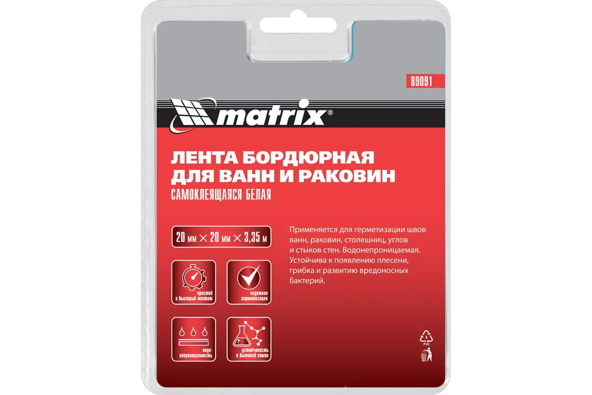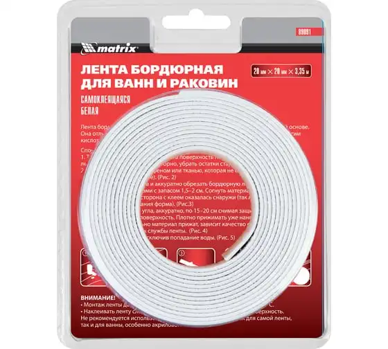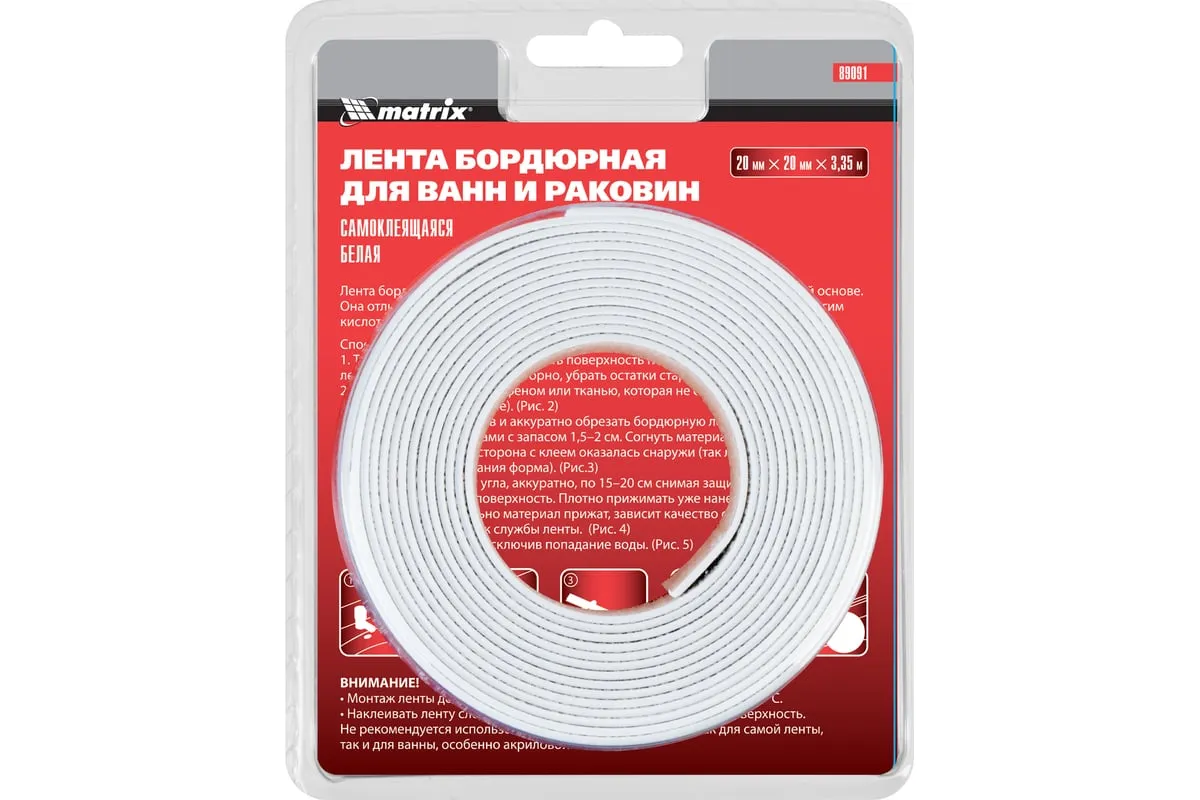 Бордюрная лента Matrix 89091 размером 20 мм х 20 мм х 3,35 м используется для герметизации швов ванн, раковин, столешниц, подходит для фиксации в углах и стыках стен. Надежно фиксируется на глянцевых поверхностях и выдерживает эксплуатацию в условиях повышенной влажности.