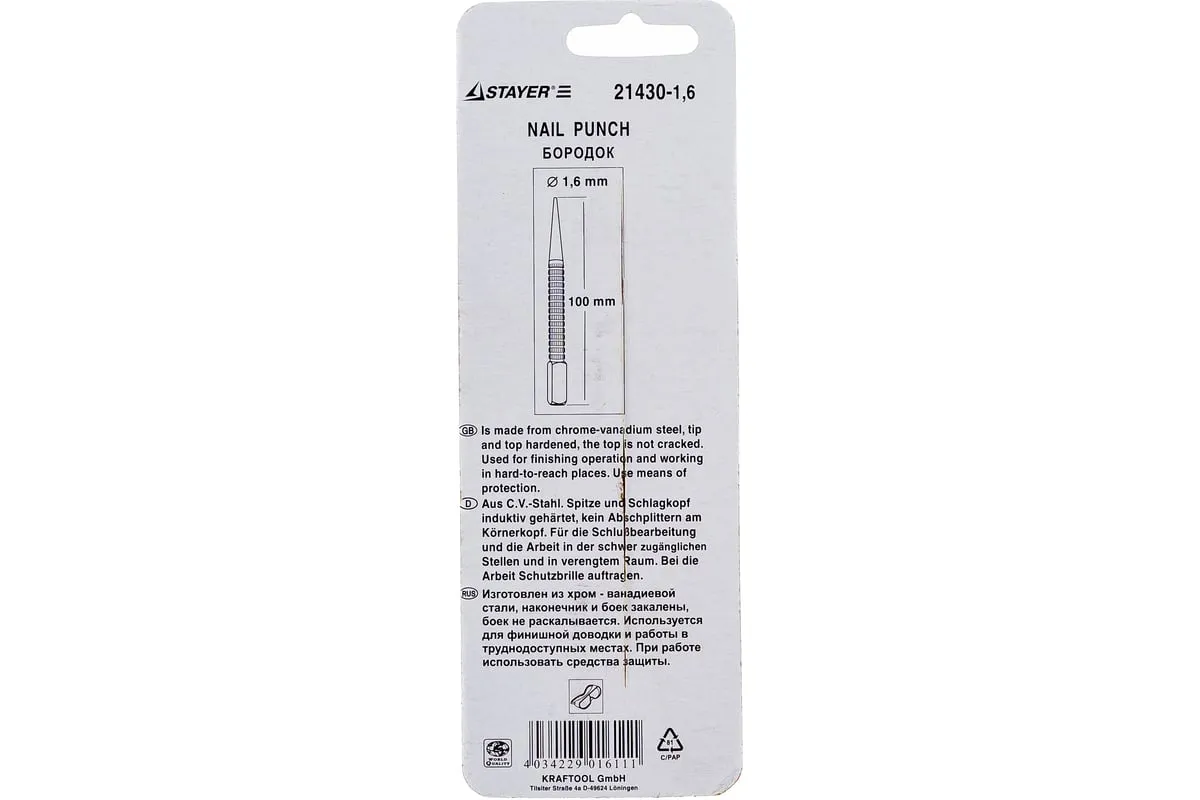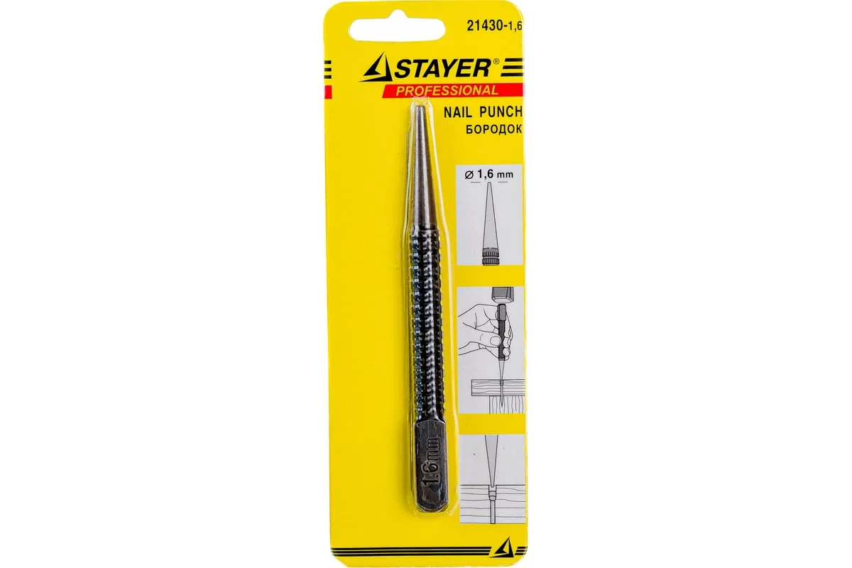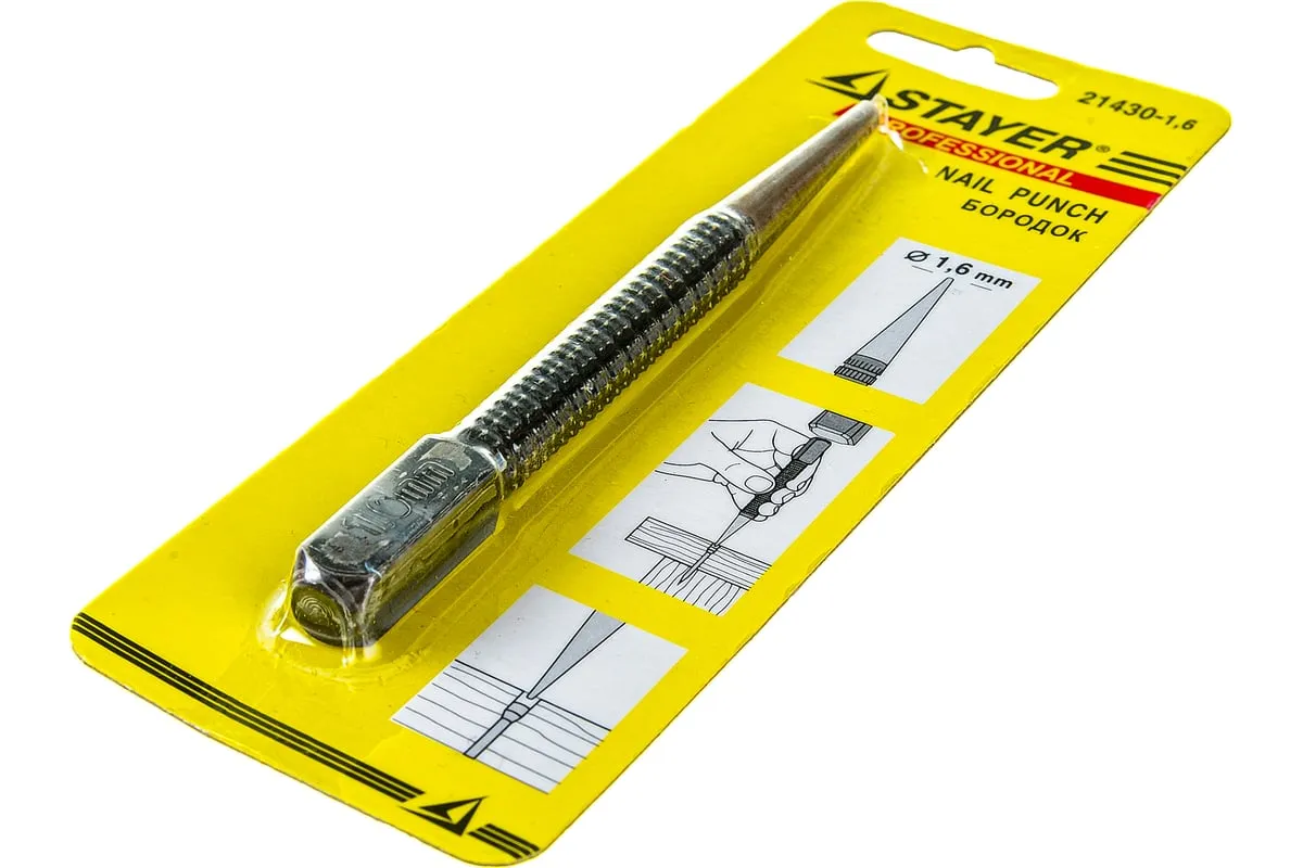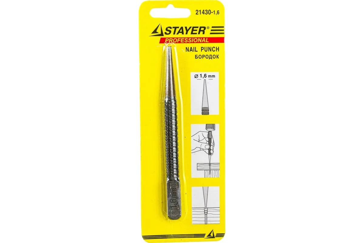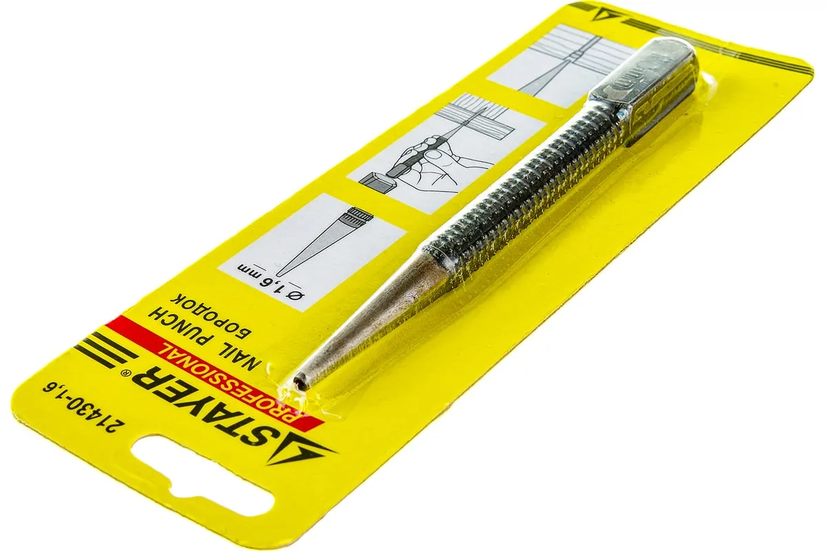 Бородок-добойник серии "Master" Stayer 21430-1.6 применяется для пробивания отверстий, создания отметин в тонком листовом металле. Также может быть использован для добивания крепежа. Бородок-добойник изготовлен из закаленной хромованадиевой стали и имеет покрытие чернением, что придает высокие коррозионностойкие свойства и большой ресурс работы. Рифленый наконечник легко удержать в руке.