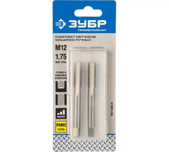 Метчики, машинно-ручные, комплектные для нарезания метрической резьбы в сквозных отверстиях, М12х1,75, 2шт Зубр ПРОФЕССИОНАЛ 4-28007-12-1.75-H2_z01