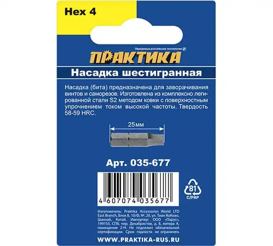 Бита HEX 4 (2 шт; 25 мм) ПРАКТИКА 035-677