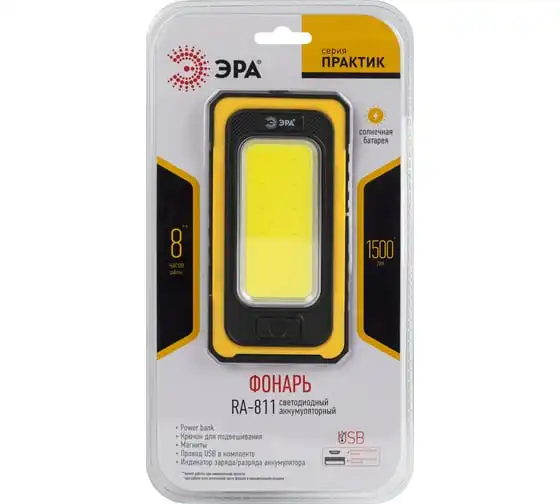 Светодиодный фонарь ЭРА Рабочие Практик RA-811 ручной, аккумуляторный, 15 Вт COB, powerbank, солнечная батарея, магнит Б0054472