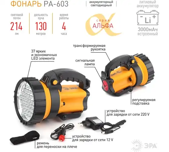 Фонарь-прожектор ЭРА PA-602 Альфа 19xLED, литий 3Ач, ЗУ 220V+12V, карт Б0031033
