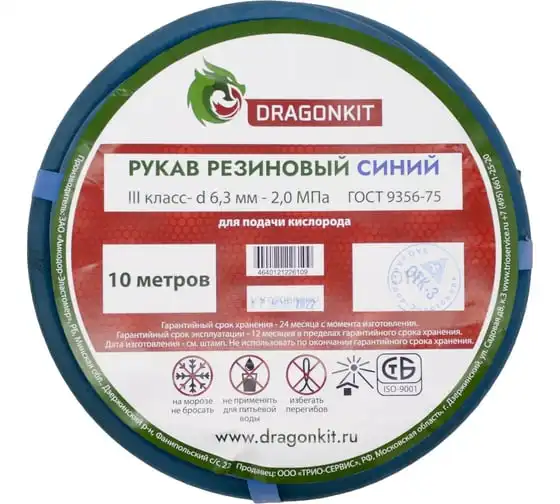 Рукав газовый 9 мм, 10 м, синий, 3 класс DRAGONKIT 00-00002676