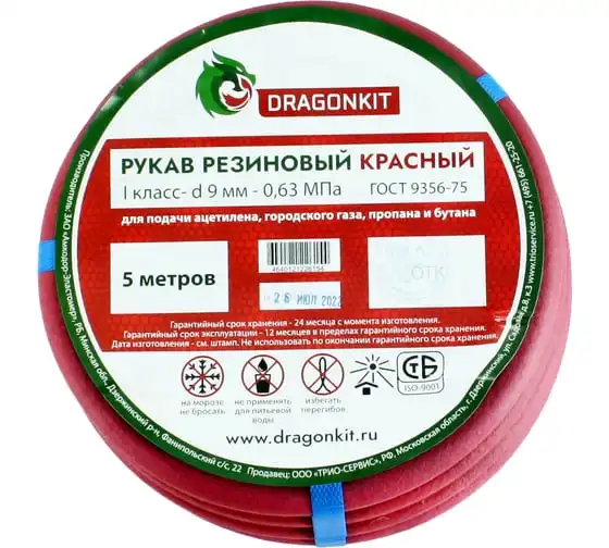 Рукав газовый 9 мм, красный, 1 класс, 5 м DRAGONKIT 00-00002684