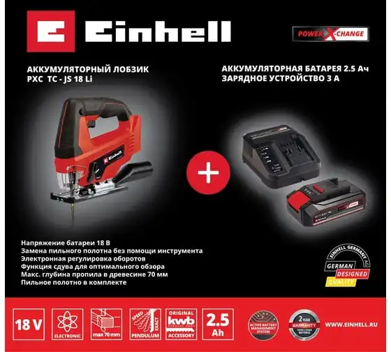 Аккумуляторный лобзик Einhell pxc tc-js 18 li, 70 мм, quick, маятник + 1 акк. pxc 2.5 Ач 18 В + ЗУ 3 А 4321209SET