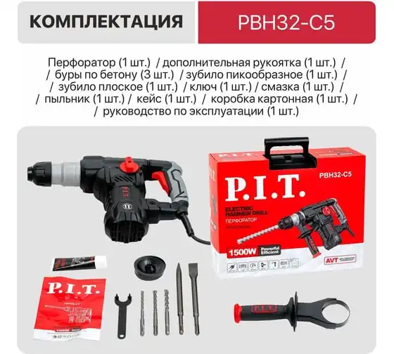 Перфоратор электрический P.I.T. МАСТЕР SDS-Plus верт, 1500Вт, 6Дж, 3режима, Ø32мм, 0-920об/мин PBH32-C5