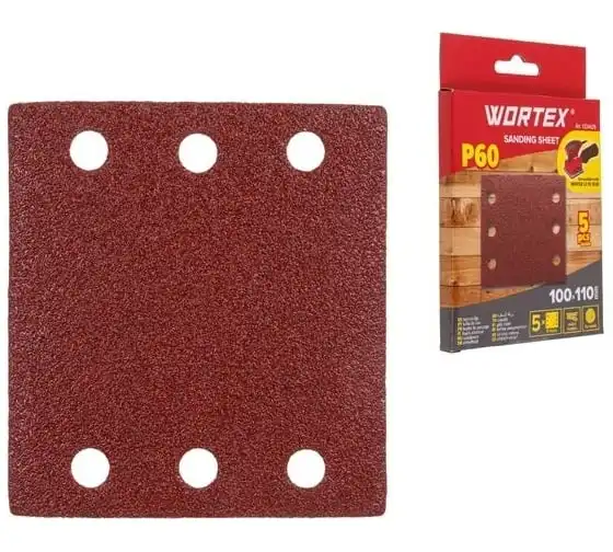 Шлифлист для дерева 100x110 мм, Р60, самосцепляющийся, 6 отверстий, 5 шт WORTEX 1334429