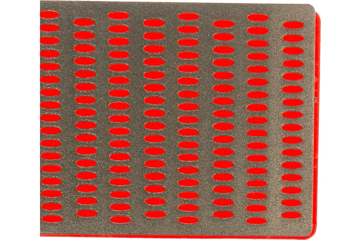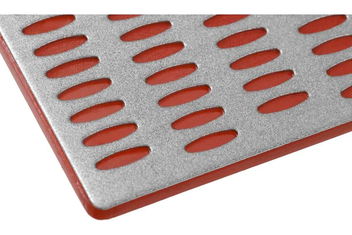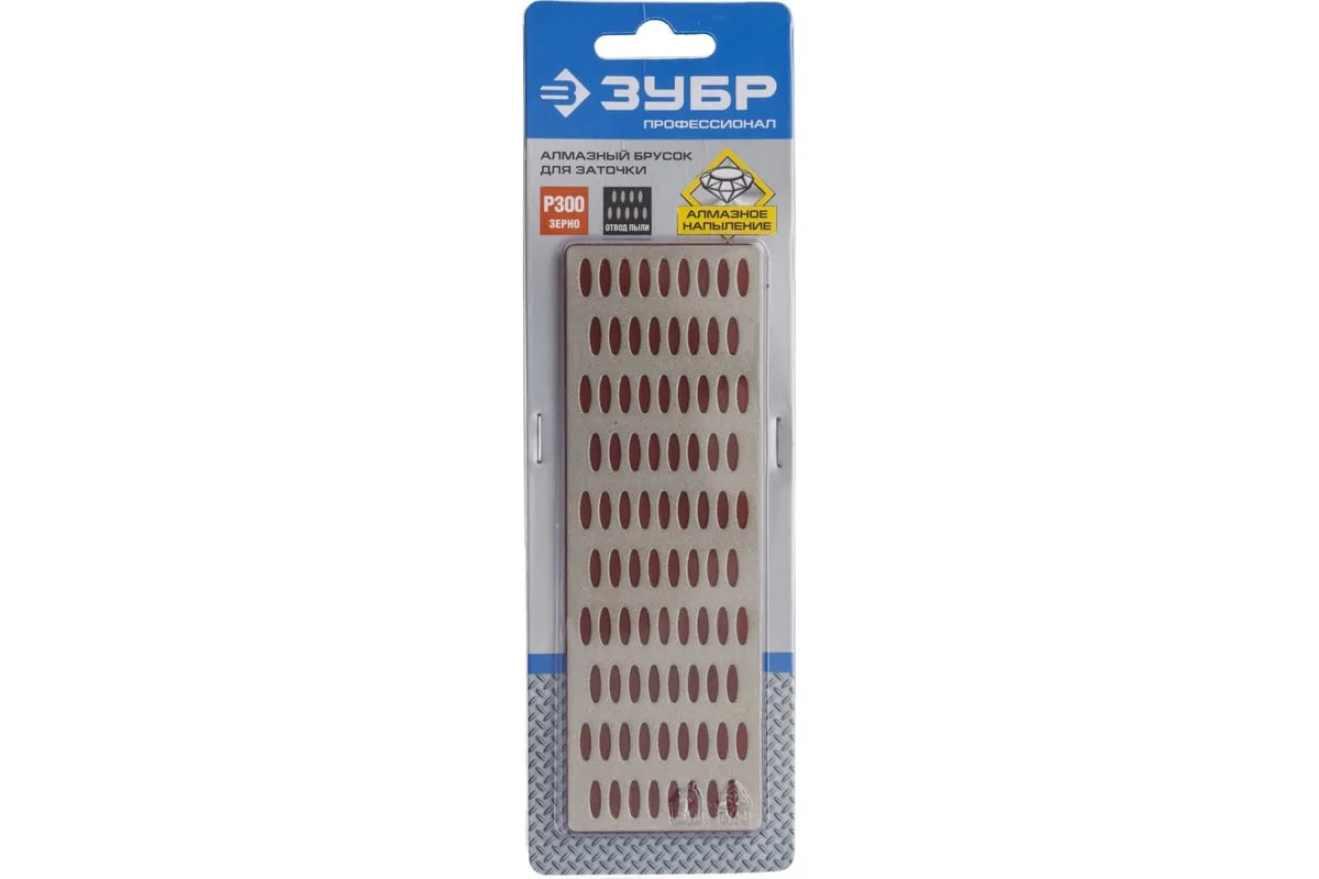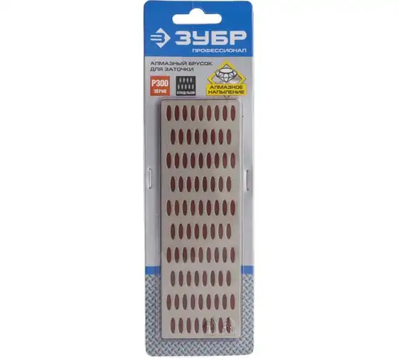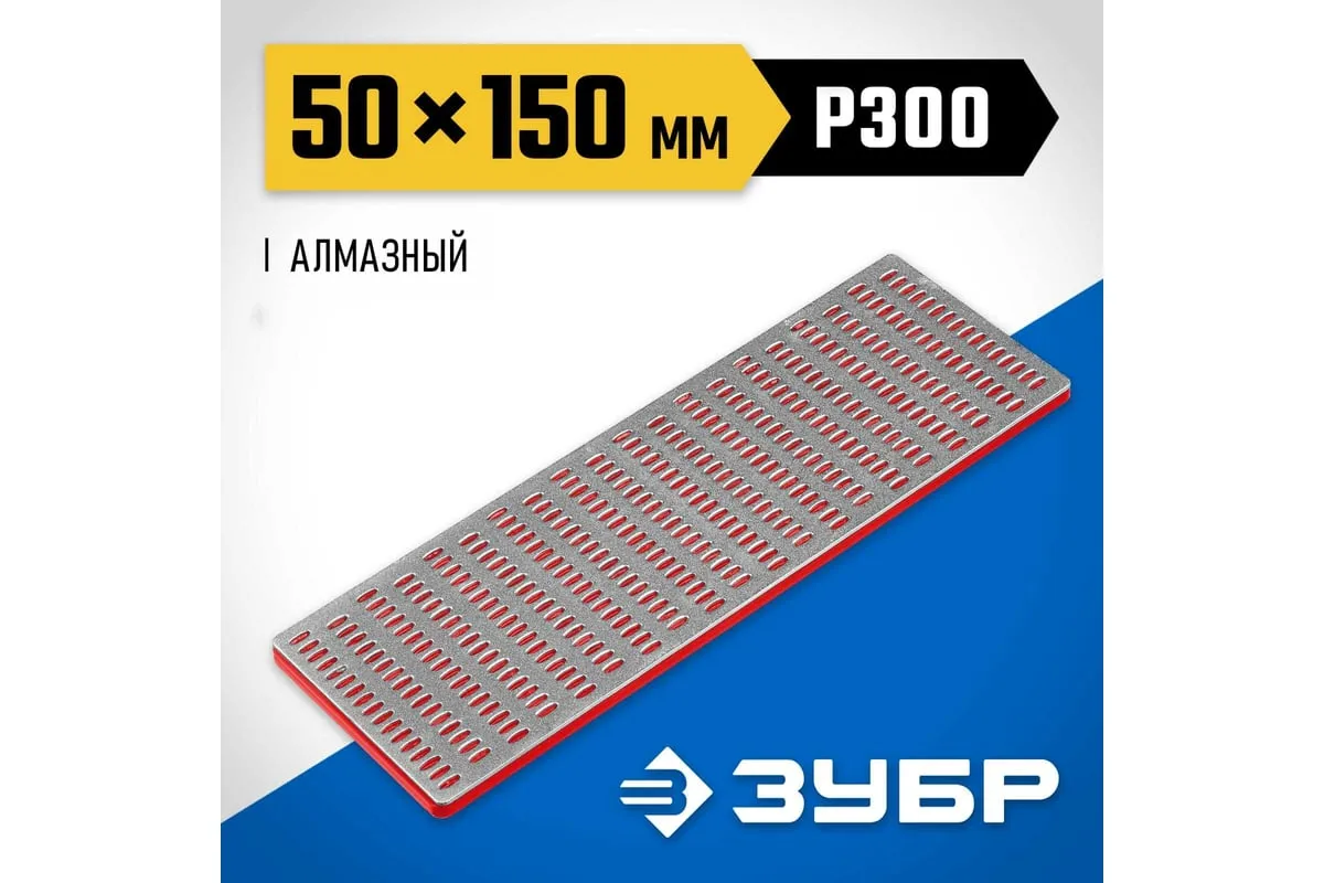 Брусок алмазный заточной ПРОФЕССИОНАЛ (50х150 мм; Р300) ЗУБР 35715-02_z01 применяется для заточки и финишной доводки ножей, ножниц, столярного и плотницкого инструмента. Перфорация защищает поверхность пластины от забивания частицами абразивной и металлической пыли. Размер – 50х150 мм. Зернистость – P300. Цвет подложки – красный.