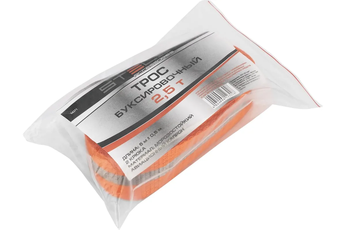 Буксировочный трос 2,5 тонны STELS 54371 незаменим в случае поломки автомобиля. Изготовлен из авиационного капрона, отличающегося стойкостью к низким температурам и резкому изменению влажности. Для удобства хранения помещен в индивидуальную упаковку. Трос обладает грузоподъемностью в 2.5 тонны и при продолжительной эксплуатации не меняет свои линейные размеры. Длина 5 м.