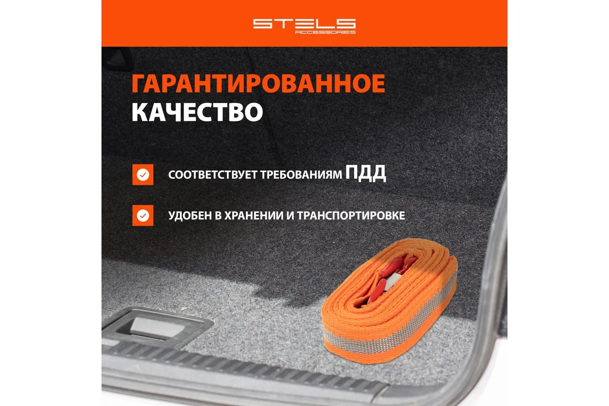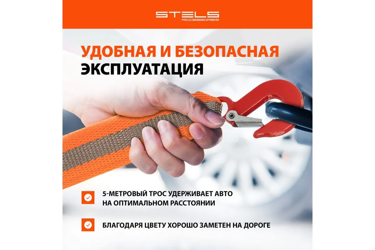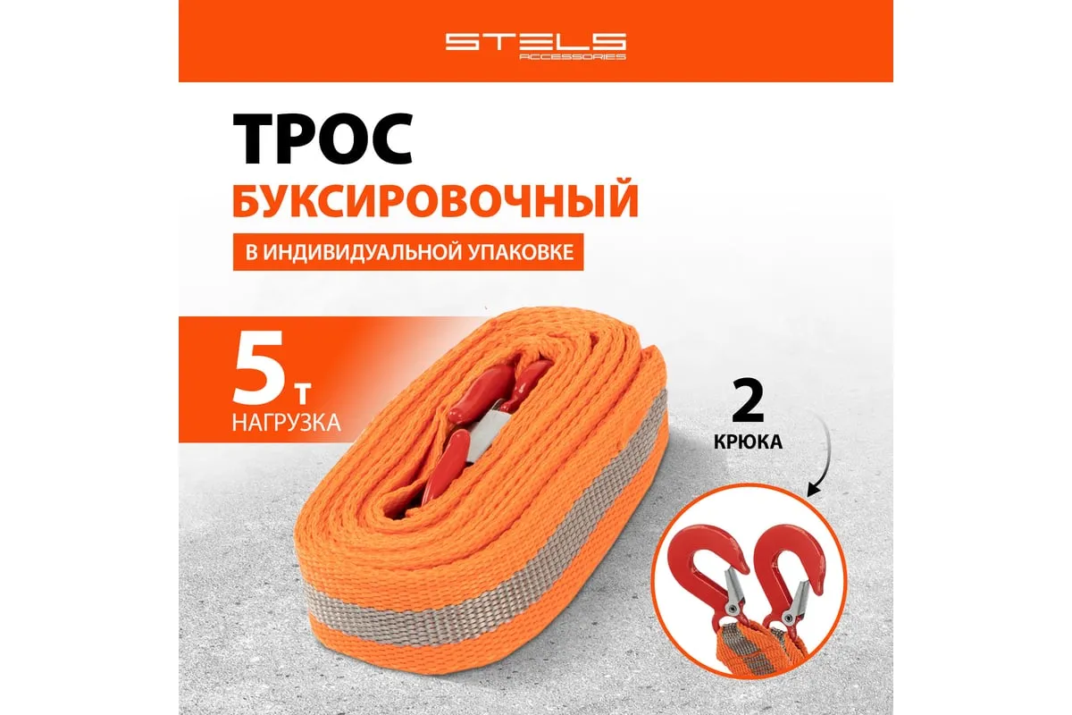 Буксировочный трос 5 тонн STELS 54375 - приспособление с двумя крюками для буксирования транспортных средств, вес которых не превышает 5 тонн. Не подвержен воздействию окружающей среды, не боится ни низких температур ни большой влажности. При изготовлении троса учитывались требования правил дорожного движения. Длина троса 5 метров.