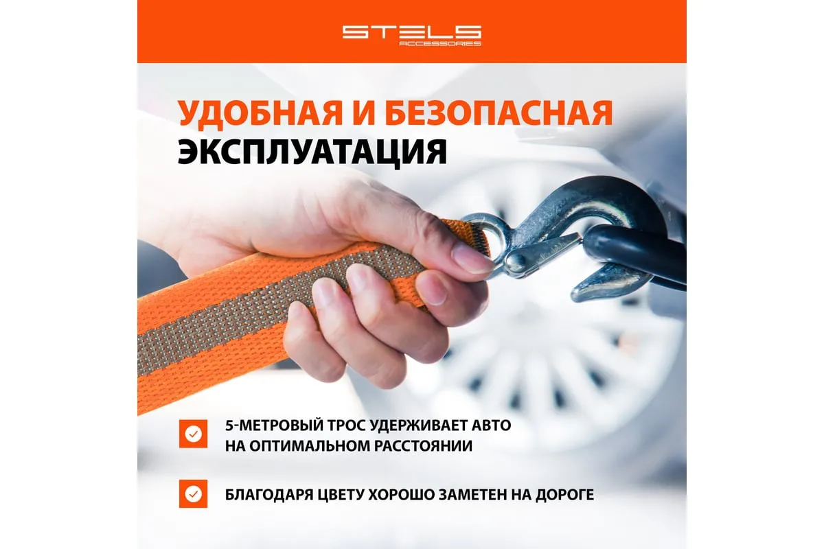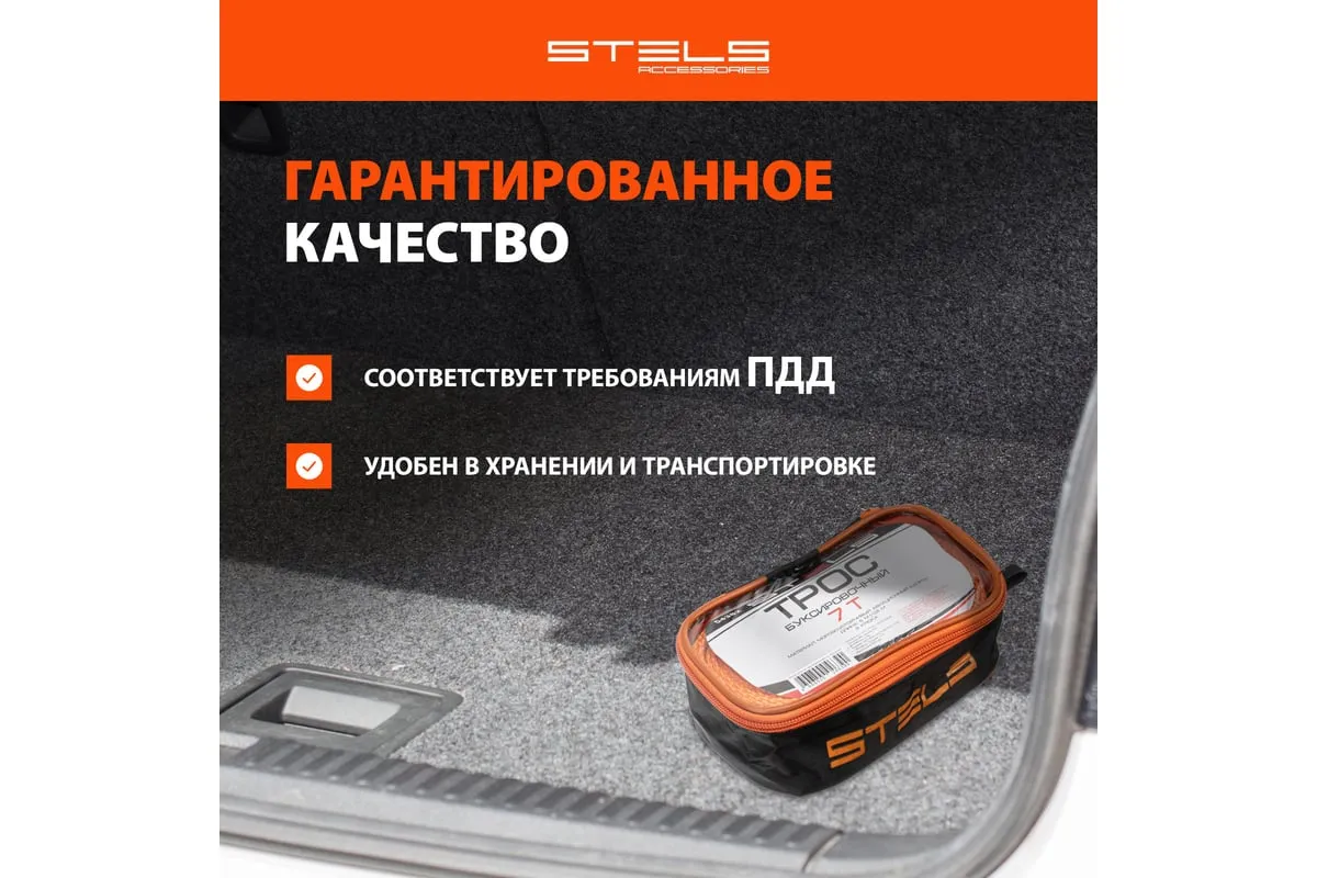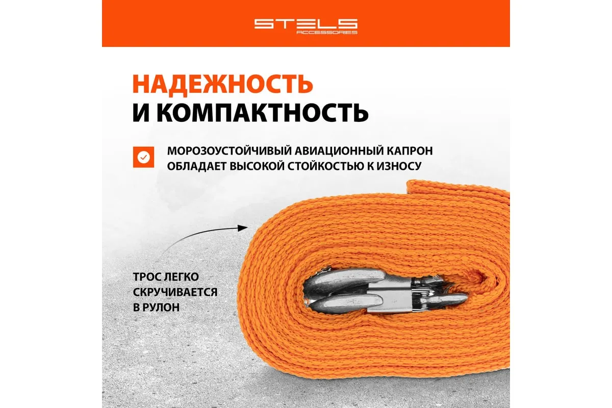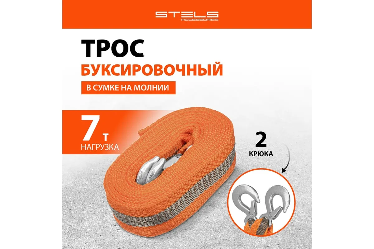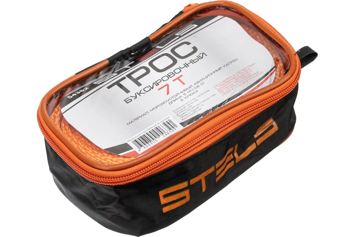 Буксировочный трос STELS 7 тонн 2 крюка сумка на молнии 54382 изготовлен из морозостойкого авиационного капрона, обладающего стойкостью к большим нагрузкам (до 7 тонн) и воздействию окружающей среды. Трос предназначен для буксировки автомобиля, обладает двумя крюками. Изделие поставляется в удобной сумке на молнии.