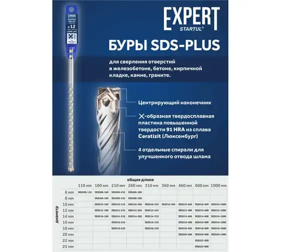 Бур SDS-plus EXPERT STARTUL предназначен для использования с перфораторами, оснащенными системой крепления SDS-plus. Это делает его идеальным выбором для сложных задач, таких как сверление отверстий в прочных материалах, таких как железобетон, бетон, кирпичная кладка, камень и гранит.
