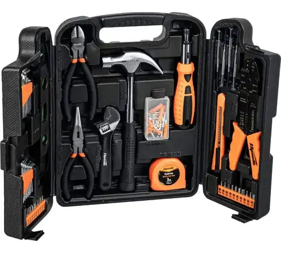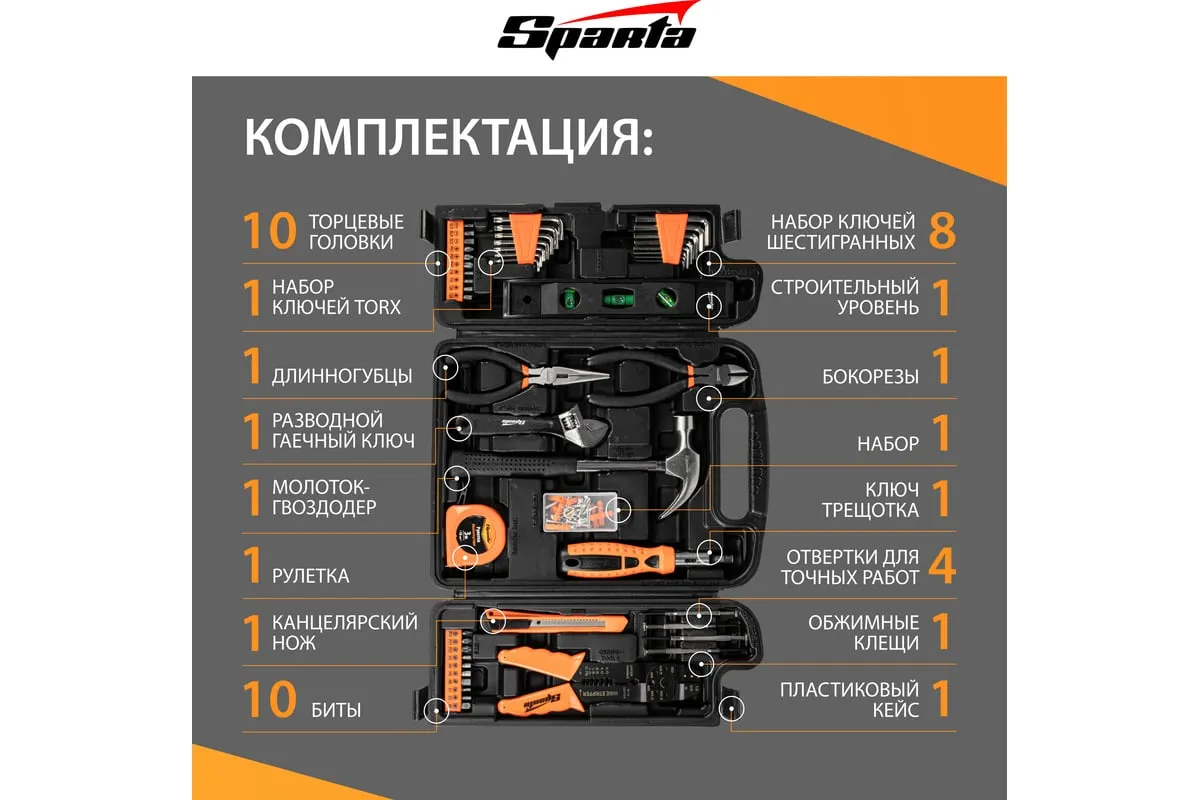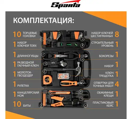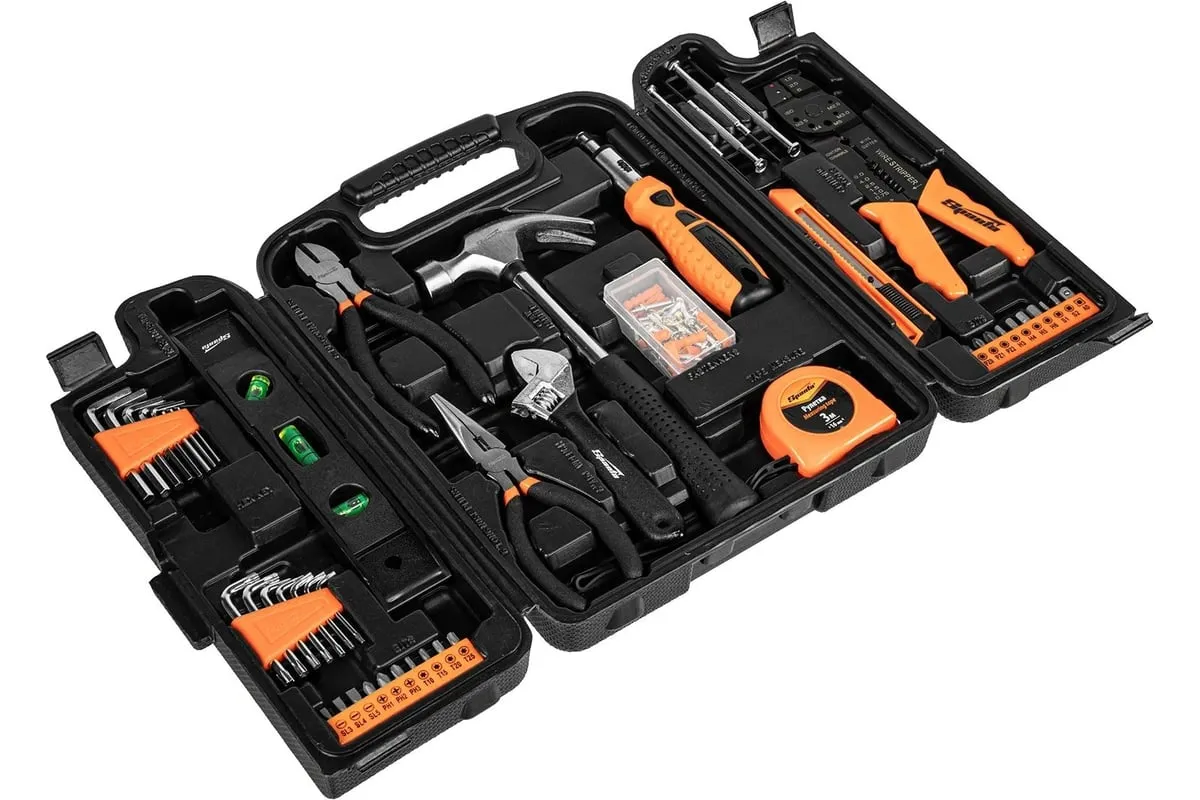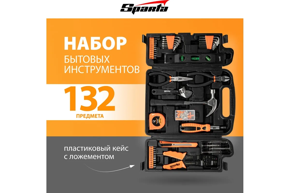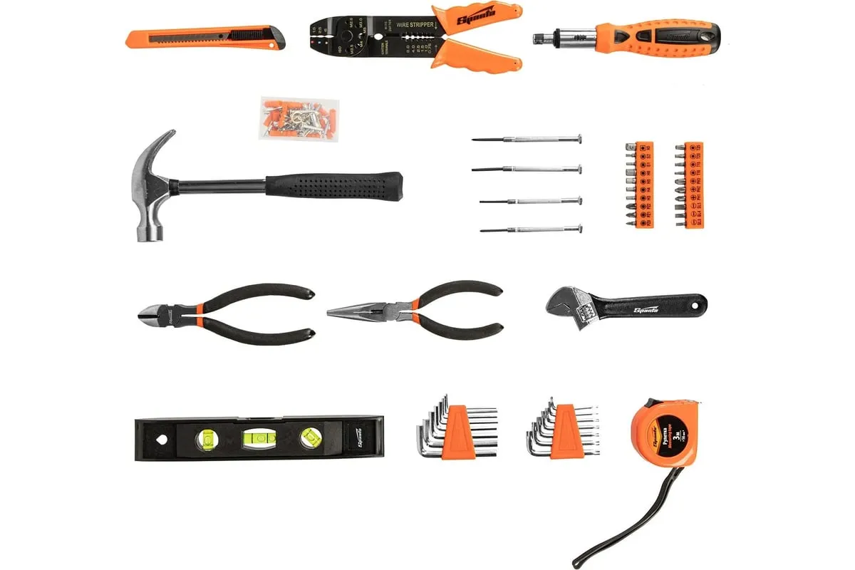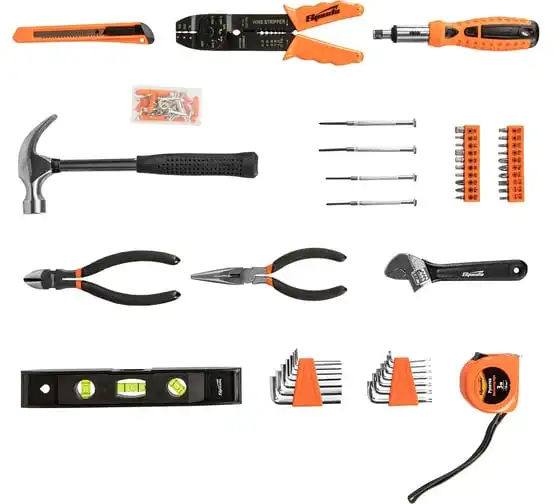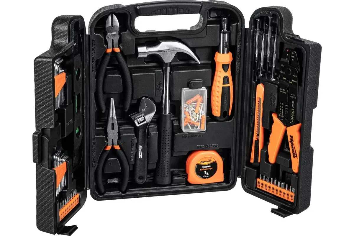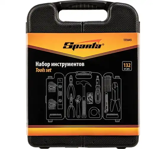 Набор инструментов включает в себя 132 предмета для бытового применения: обжимные клещи, отвертки, в том числе для точных работ, молоток-гвоздодер, бокорезы, строительный уровень, разводной и имбусовые ключи, биты-вставки с адаптером, длинногубцы, рулетку, канцелярский нож, а также набор крепежа. Инструменты оптимально подходят для выполнения слесарно-монтажных работ дома или на даче.