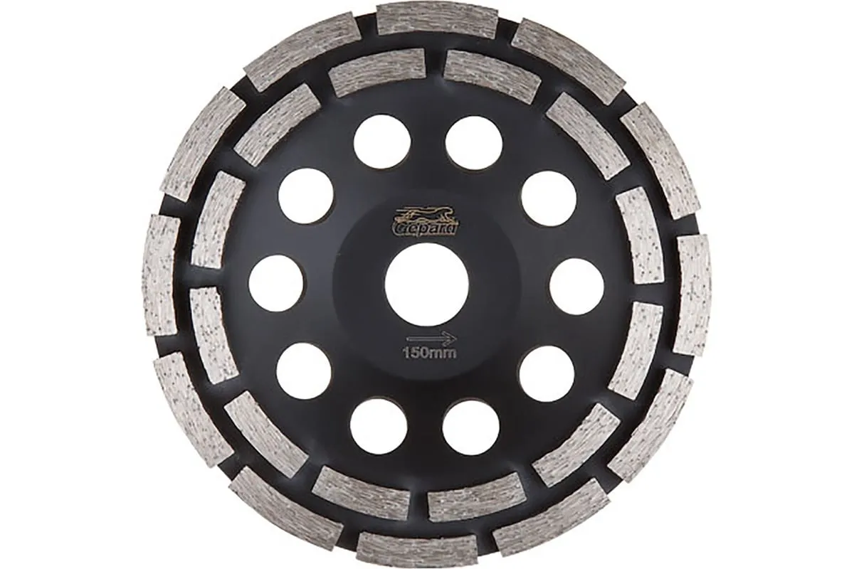 Чашка алмазная шлифовальная 150x22.2 мм двурядная Gepard GP0808-150 для снятия толстых слоев бетона, удаления швов и наплывов бетонных, гранитных, мраморных, кирпичных, каменных и других особо твердых поверхностей. Назначение: грубое шлифование (черновое), обрабатываемая поверхность остается шероховатой. Изделие является сменной составной частью углошлифовальных или мозаично-шлифовальных машин, имеющих посадку 22,2 миллиметра. Имеет высокий ресурс использования.