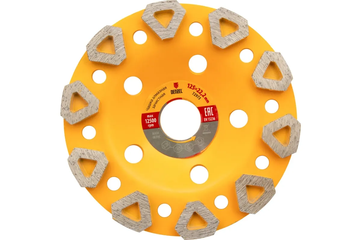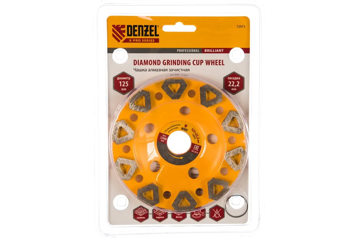 Алмазная зачистная чашка Denzel «Бриллиант» 72973 с посадочным отверстием 22,2 мм устанавливается на углошлифовальные машины, работающие с оснастками диаметром 125 мм. Ее используют для обработки бетонных, каменных, гранитных, мраморных поверхностей и кирпичных кладок. Рабочий слой с высокой концентрацией алмазов и сбалансированной связкой устраняет неровности, зачищает швы, выравнивает стыки, удаляет наплывы (в несколько этапов), а также придает обрабатываемому материалу гладкость. Насадка рекомендована для профессионального применения.