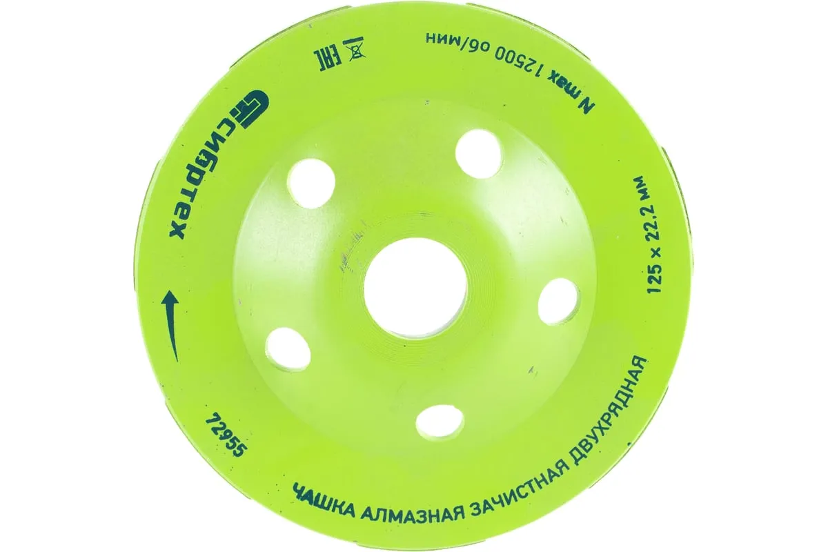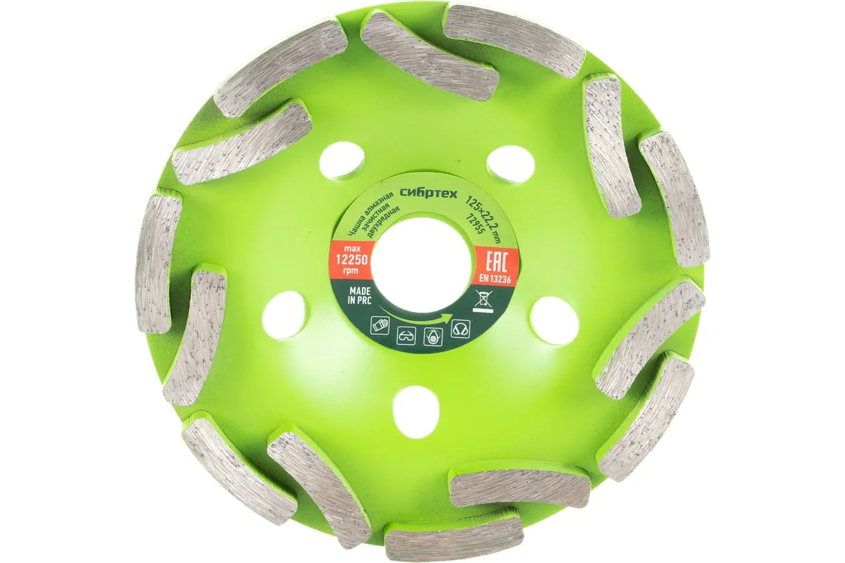 Двухрядная зачистная алмазная чашка Сибртех 72955 диаметром 125 мм устанавливается на углошлифовальную машину с посадочным размером 22,2 мм. Она оптимально подходит для интенсивной черновой обработки бетонных, каменных, мраморных, кирпичных и гранитных поверхностей, позволяет готовить их к последующей отделке. Чашка справится с такими задачами, как снятие толстого слоя бетона, выравнивание швов и устранение наплывов после снятия опалубки, удаление крупных дефектов. Изделие предназначено для бытового применения.