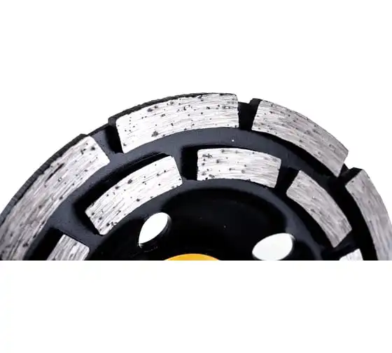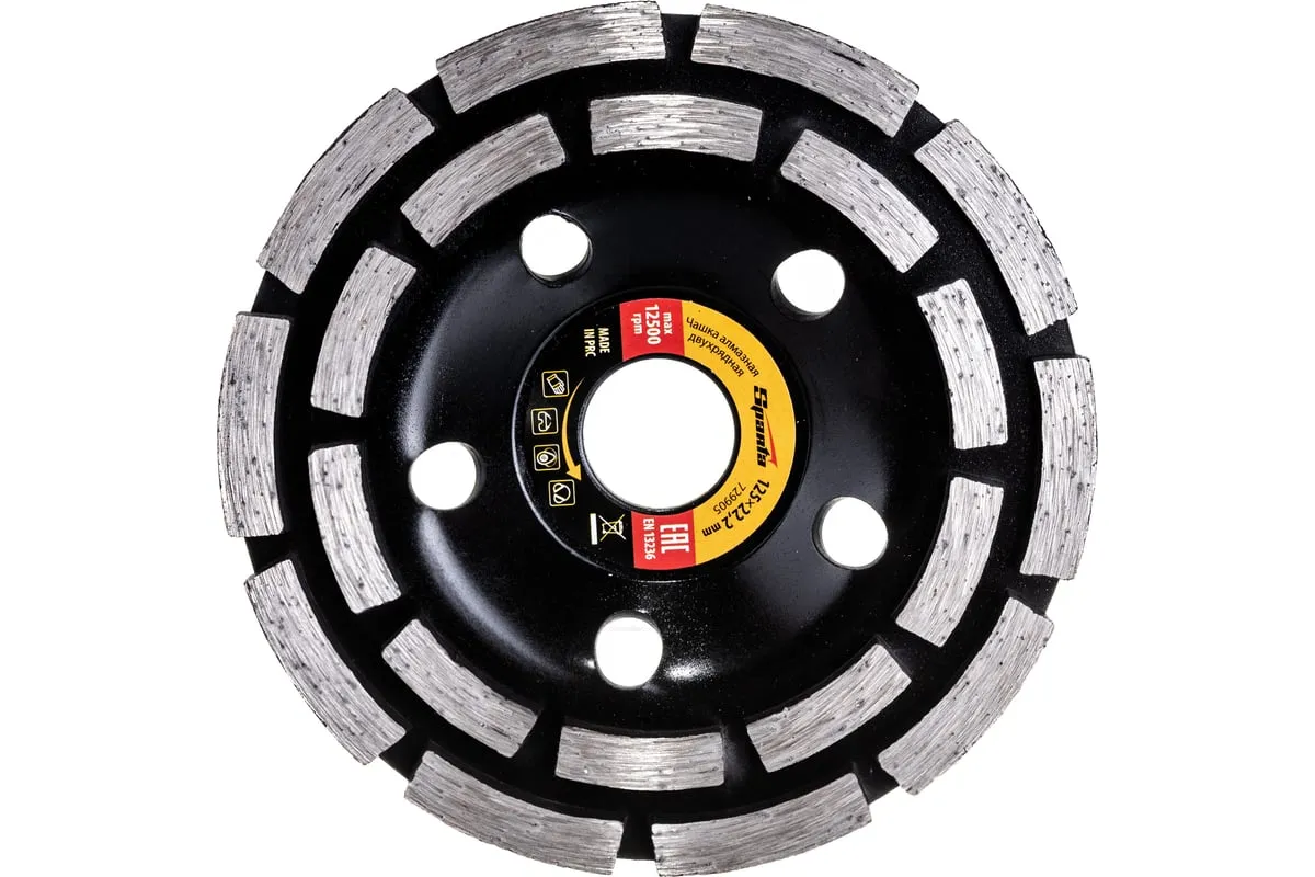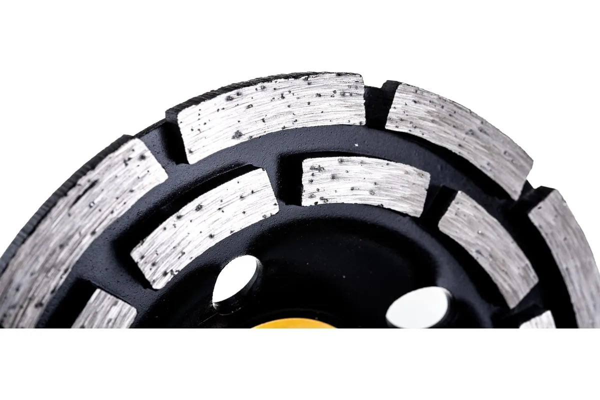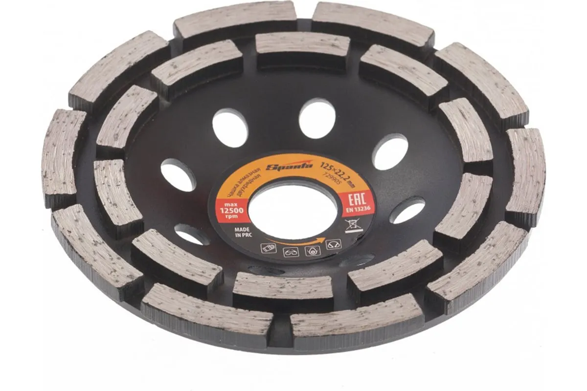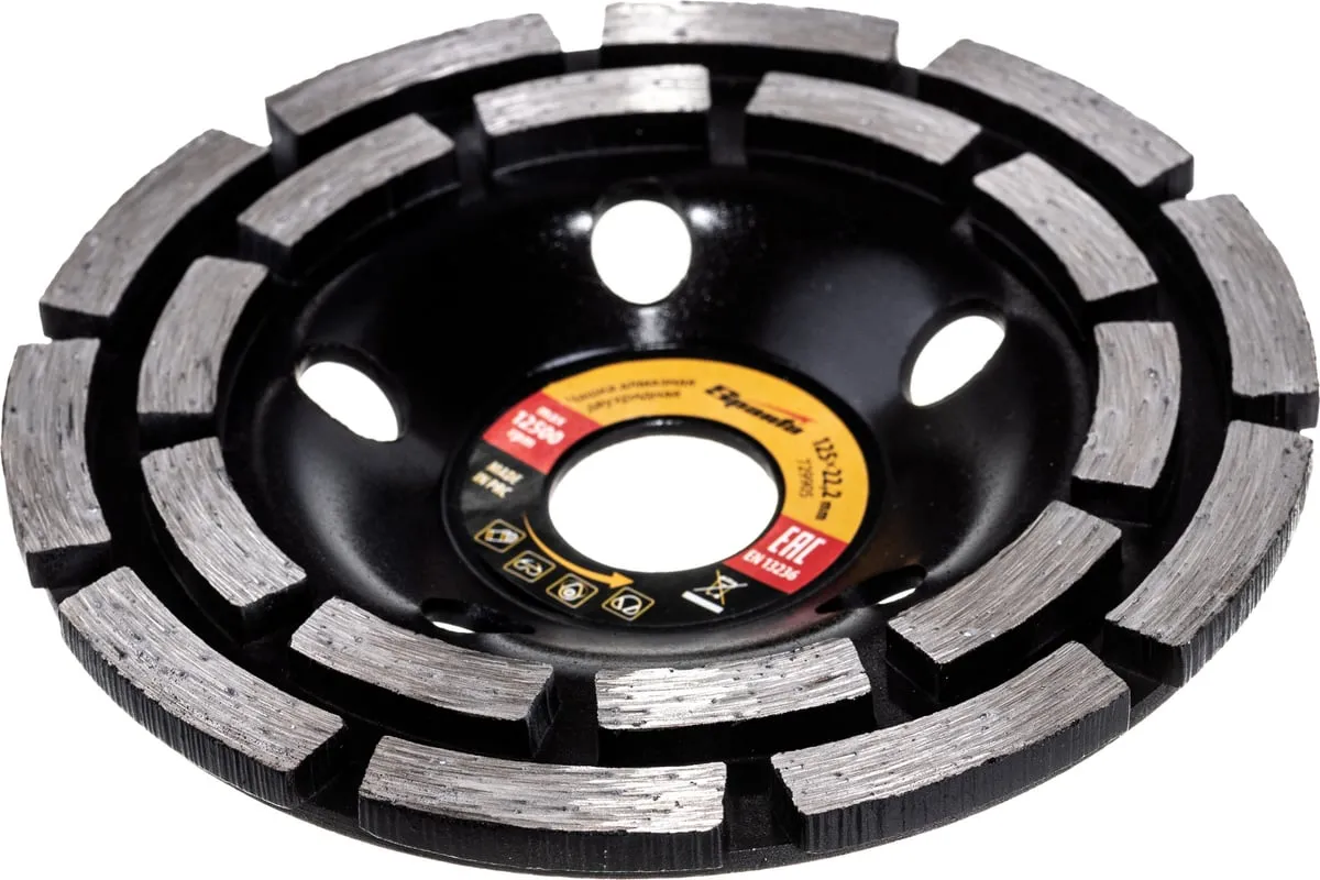 Двухрядная алмазная зачистная чашка Sparta 729905 с посадочным отверстием 22,2 мм используется с углошлифовальными машинами, совместимыми с оснастками диаметром 125 мм. Применяется для грубой обработки бетонных, мраморных, гранитных, каменных и кирпичных поверхностей. Эффективно зачищает стыки и швы, устраняет крупные дефекты, удаляет наплывы, снимая толстый слой материала. Алмазные сегменты расположены в 2 ряда, что в сочетании с толщиной рабочего слоя 4,5 мм обеспечивает высокую производительность.