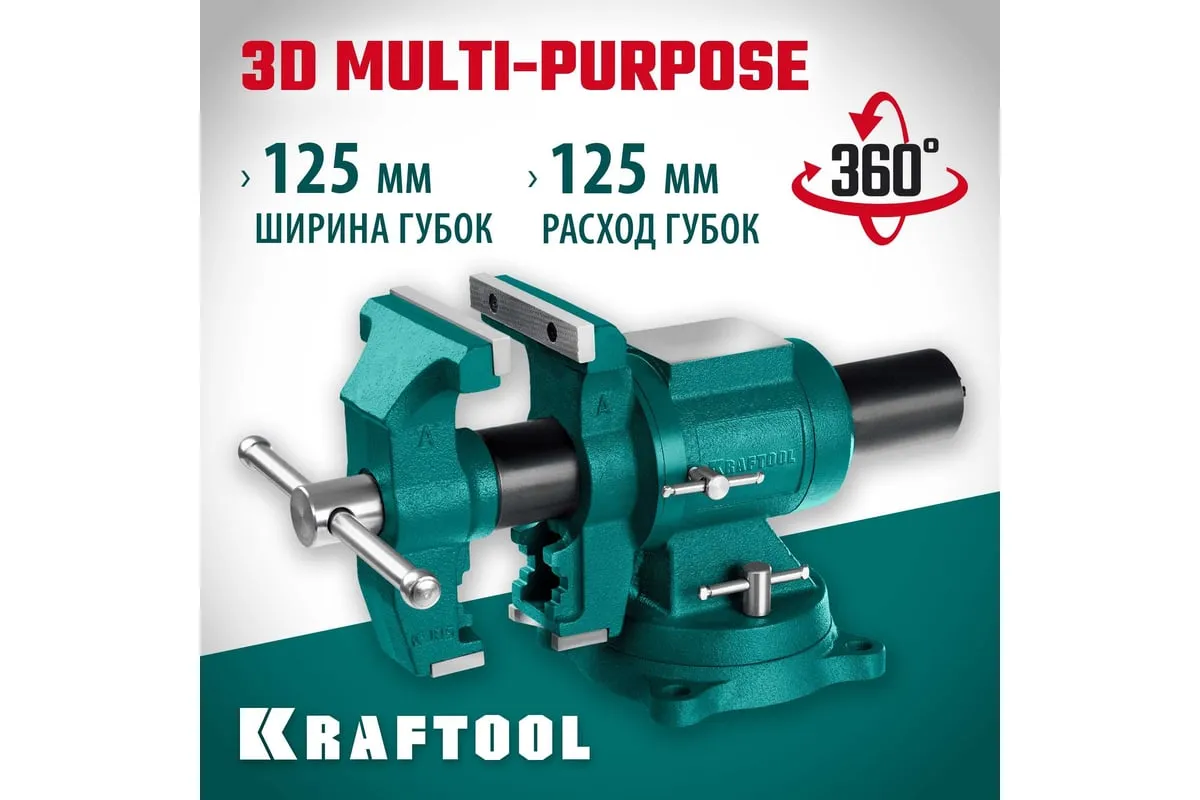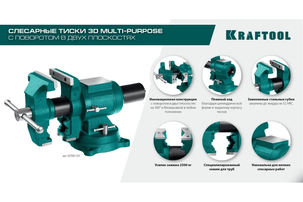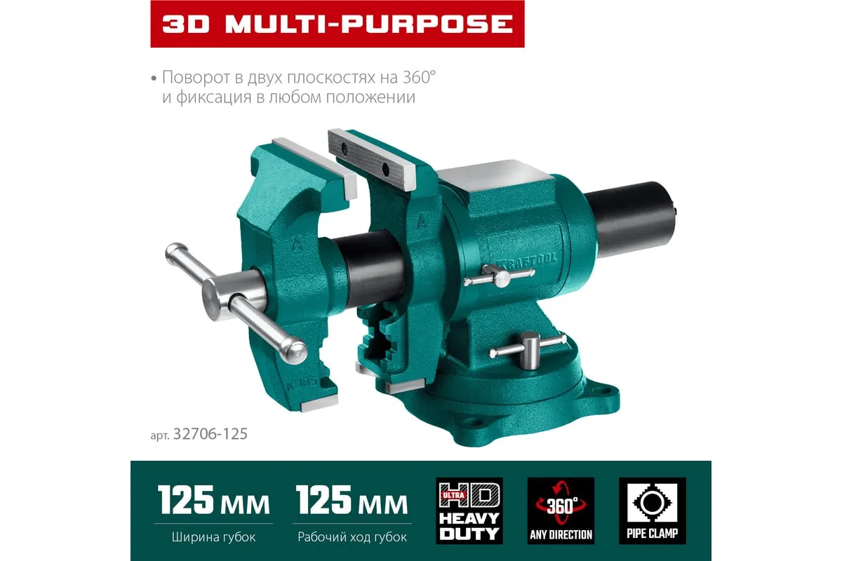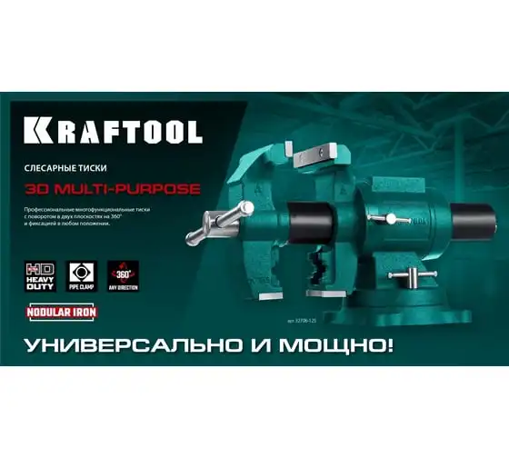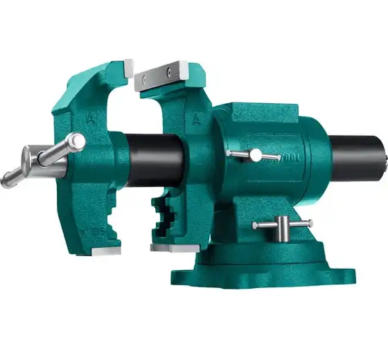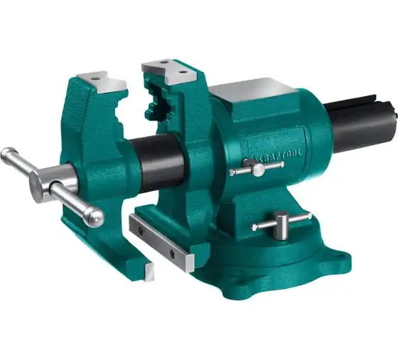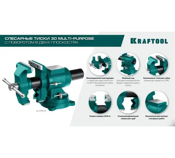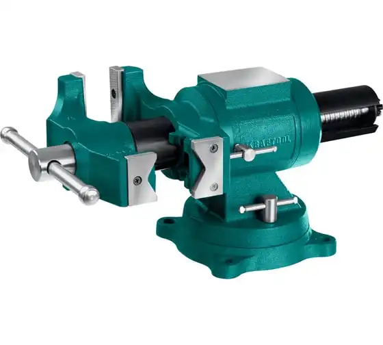 Чугунные слесарные тиски предназначены для зажима различных предметов или их отдельных составных элементов. Профессиональные 3D слесарные тиски с поворотом в двух плоскостях на 360° и блокировкой в каждой из них. Универсальная конструкция позволяет надёжно и одинаково точно фиксировать крупные и компактные заготовки. Корпус из высококачественного чугуна HT-200. Поворотное основание на 360°. Усилие зажима до 3500 кг/см2. Сменные стальные закаленные губки с рифленой поверхностью. Универсальный зажим для труб. Наковальня для мелких слесарных работ.