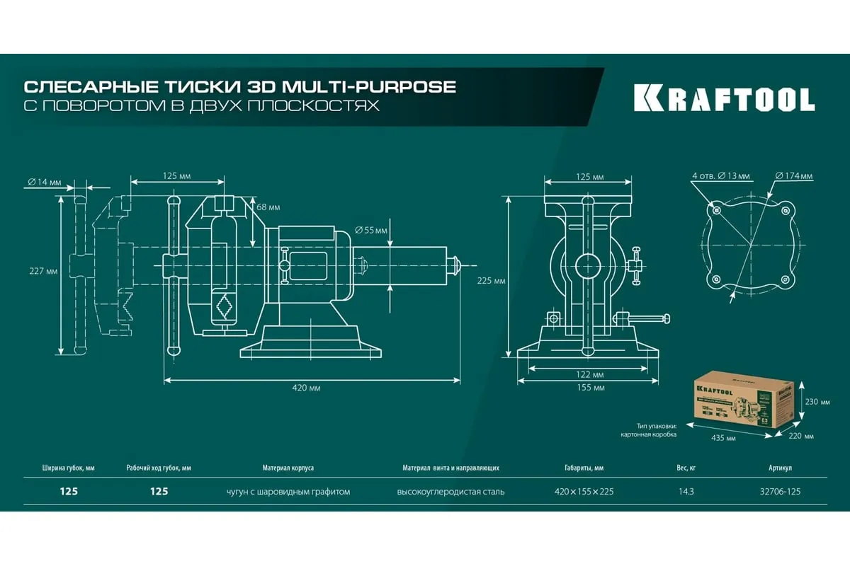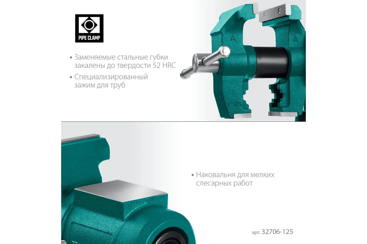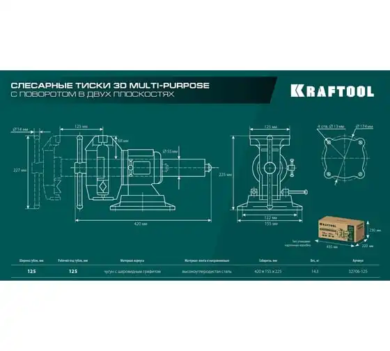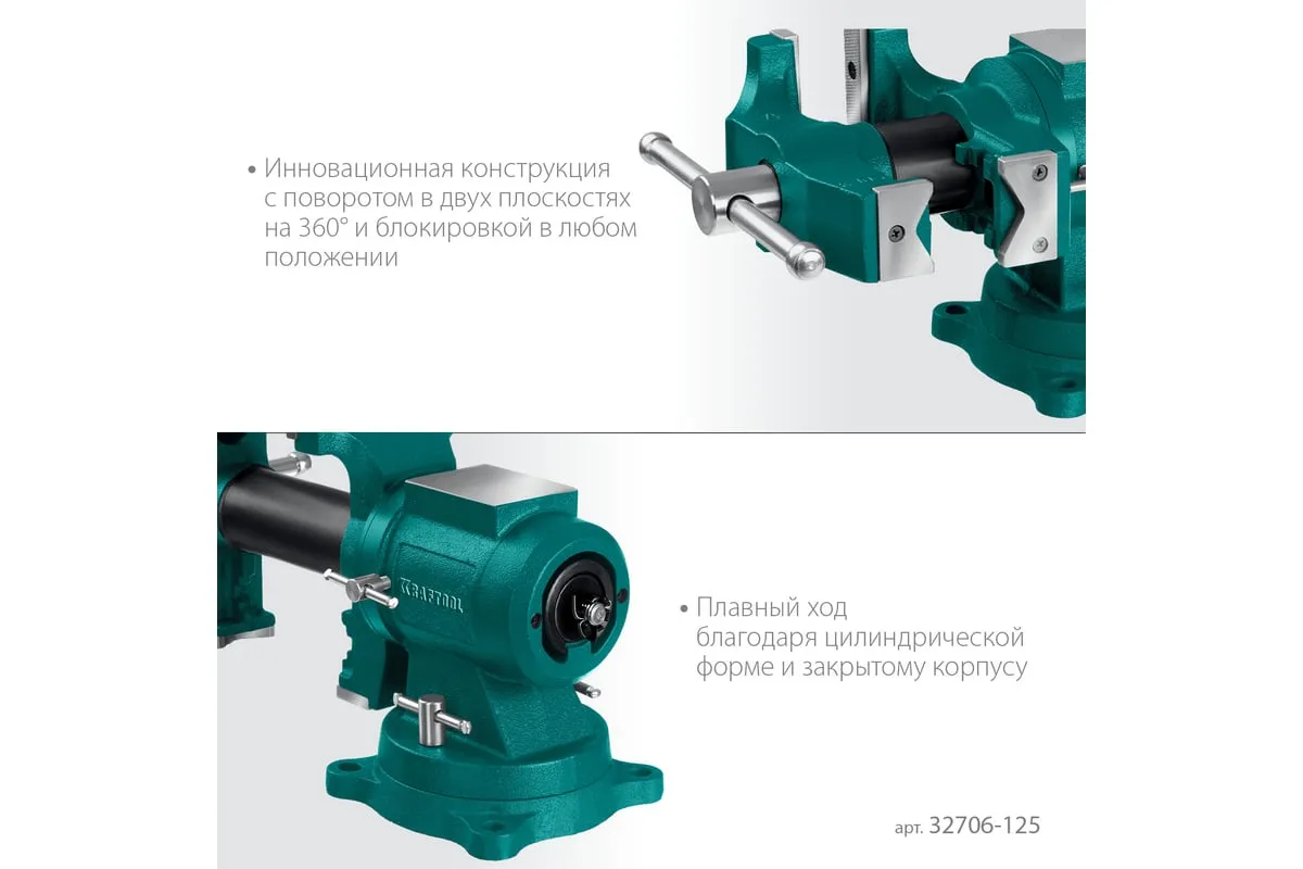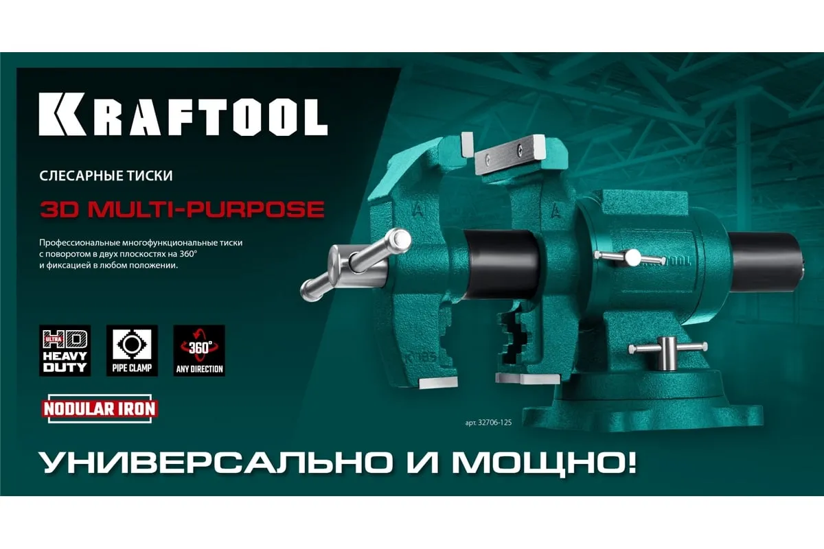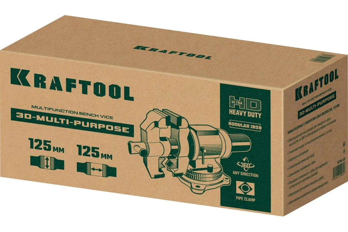 Чугунные слесарные тиски предназначены для зажима различных предметов или их отдельных составных элементов. Профессиональные 3D слесарные тиски с поворотом в двух плоскостях на 360° и блокировкой в каждой из них. Универсальная конструкция позволяет надёжно и одинаково точно фиксировать крупные и компактные заготовки. Корпус из высококачественного чугуна HT-200. Поворотное основание на 360°. Усилие зажима до 3500 кг/см2. Сменные стальные закаленные губки с рифленой поверхностью. Универсальный зажим для труб. Наковальня для мелких слесарных работ.