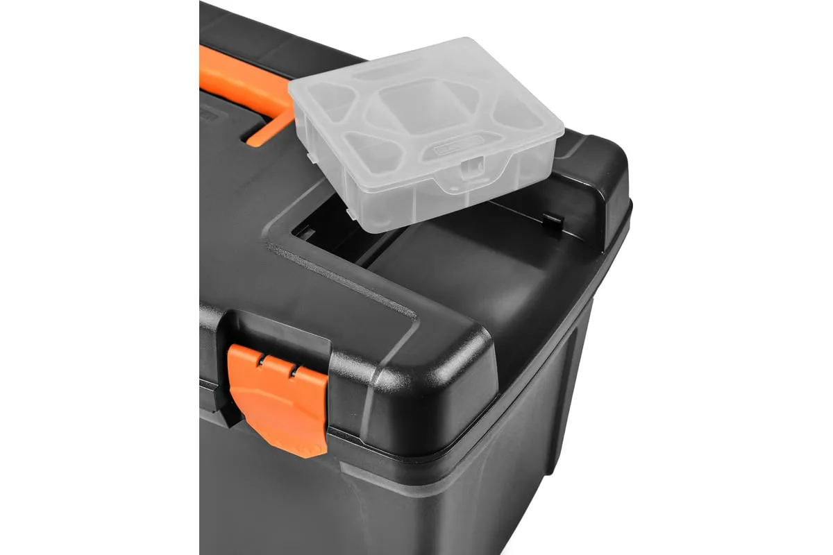 Ящик помогает содержать в порядке и быстро находить необходимые инструменты и принадлежности к ним. Идеален для использования дома, на даче, в гараже, мастерской, в автомобиле. Хранение инструментов в ящике защищает от пыли и грязи. Наличие ручки позволяет переносить инструменты на место выполнения работ. Съёмный внутренний лоток позволяет отделить инструменты и аксессуары первой необходимости от основного отсека. С помощью нанесённой на лоток размерной линейки можно быстро произвести измерения. Крышка ящика оснащена съёмными органайзерами для хранения мелочей (внутреннее пространство изменяется под потребности за счёт подвижной перегородки) и отсеком для хранения битов. Возможность использования навесного замка защитит содержимое от свободного доступа, в том числе обеспечит безопасность детей.