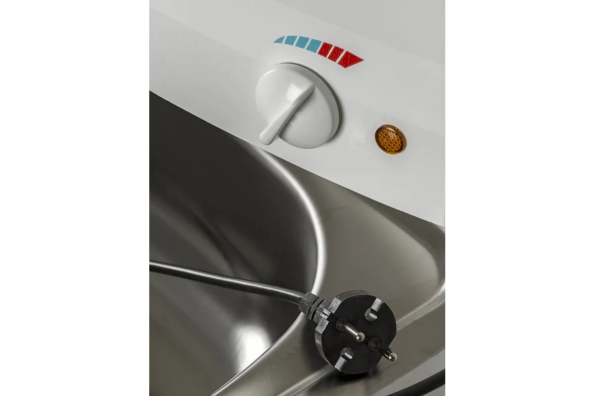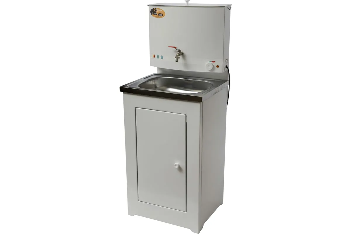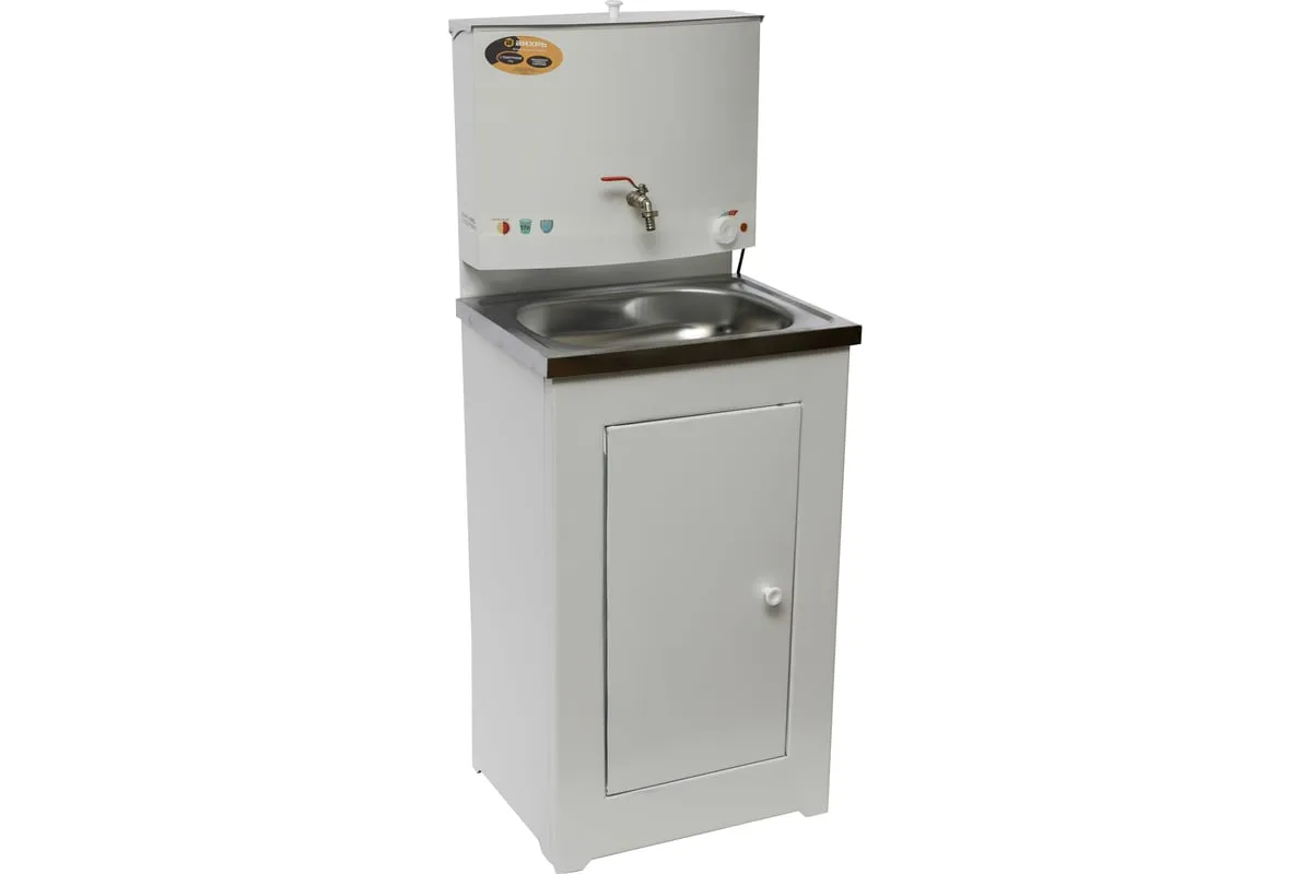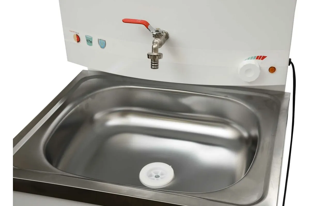 Бак для воды в дачном умывальнике увеличенный, его объём составляет 17 л. Он оснащён системой подогрева с возможностью плавной регулировки температуры, что значительно повышает комфорт пользования. Мощность – 1.3 кВт. Питание – от бытовой электрической сети 220 В. Дверца тумбы имеет увеличенные размеры, поэтому вынимать выгребную тару удобно. Умывальник можно использовать как внутри помещения, так и снаружи. Причём его небольшой вес, составляющий всего 12 кг, позволяет легко переносить умывальник с места на место.