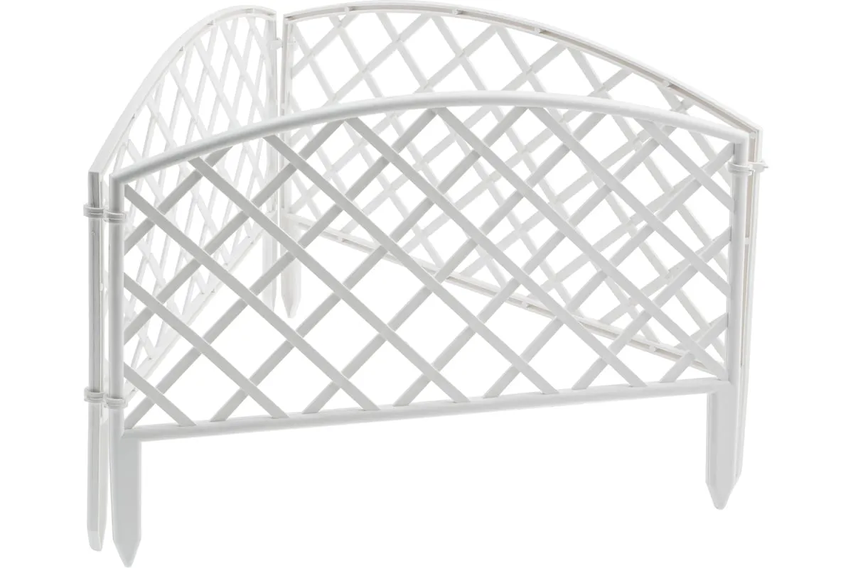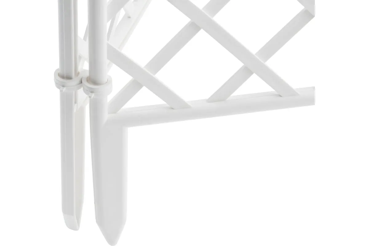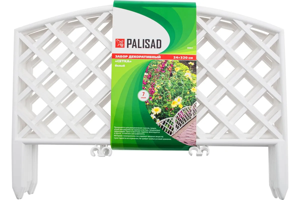 Декоративный забор Palisad «Сетка» 65021 белого цвета, размером 24 х 320 см, состоит из 7 секций и позволяет зонировать озелененный участок. С его помощью можно украсить дачную территорию — обозначить границы грядки или зоны отдыха, оформить клумбу, оградить кустарник или дерево.