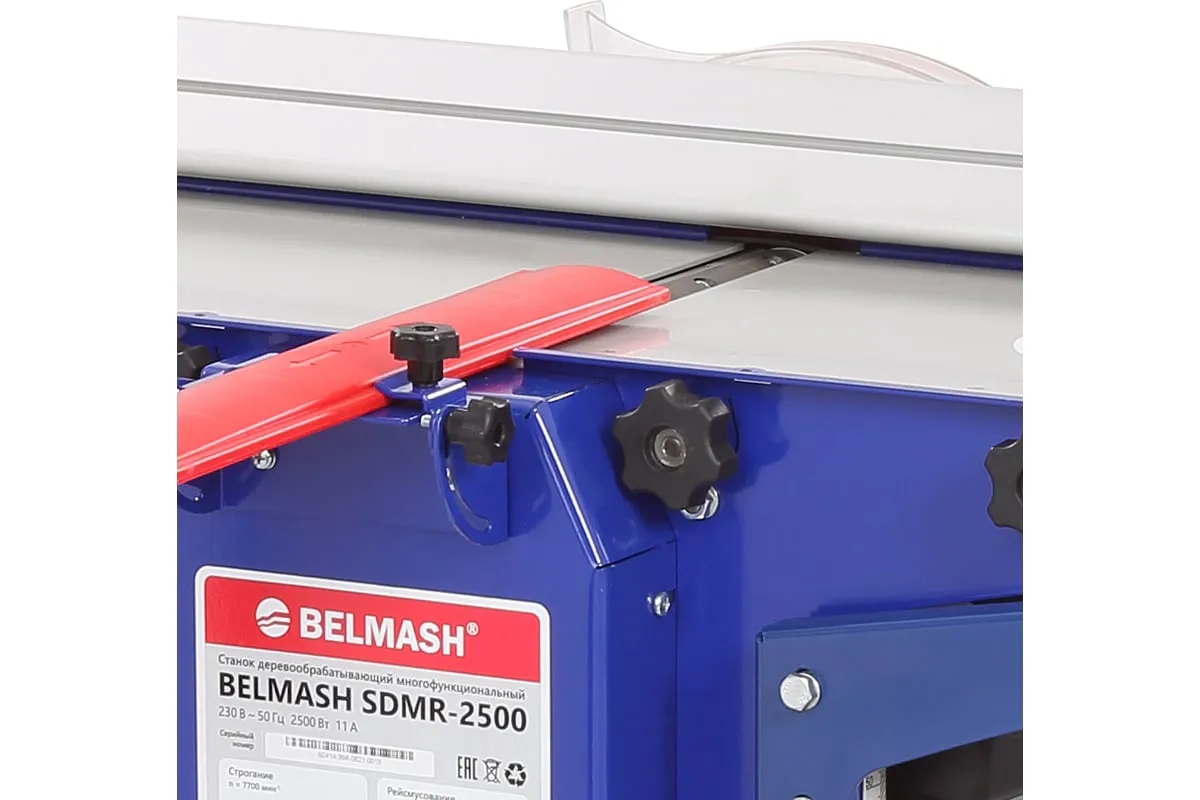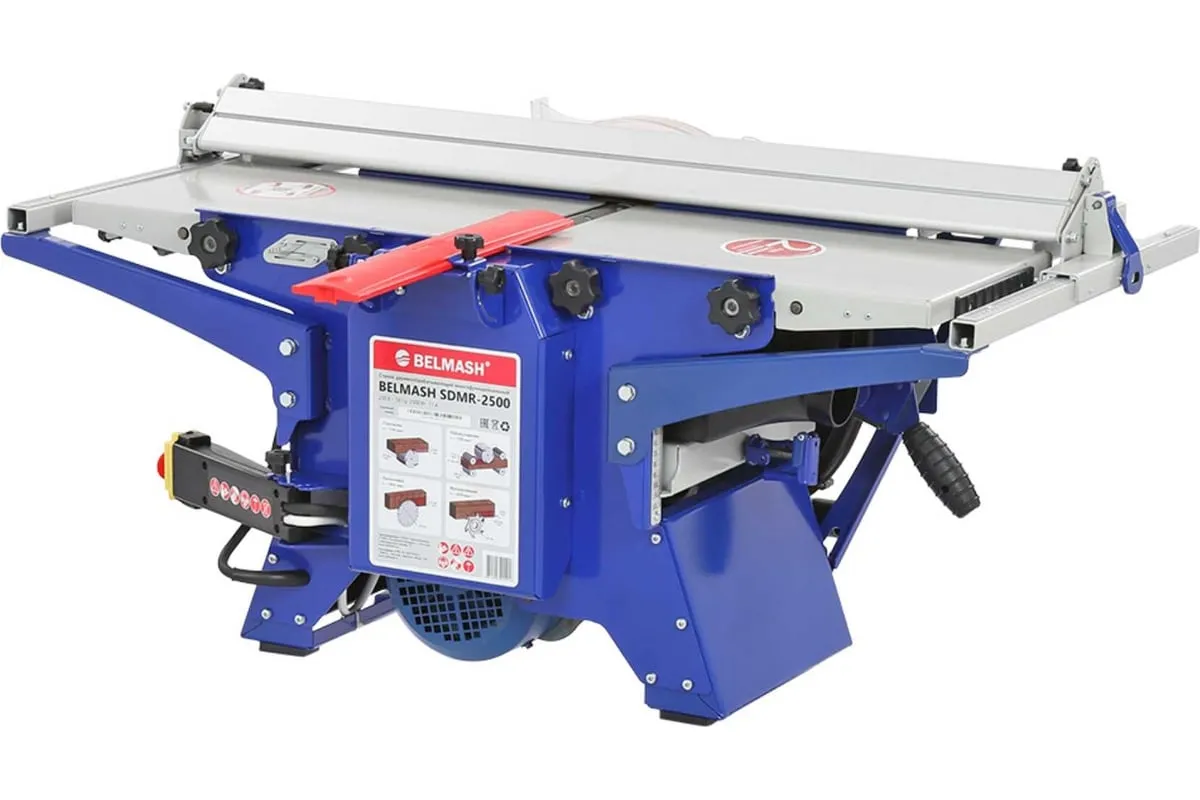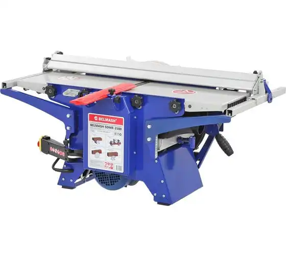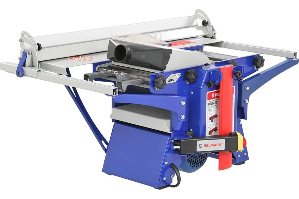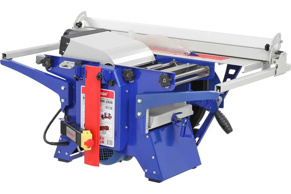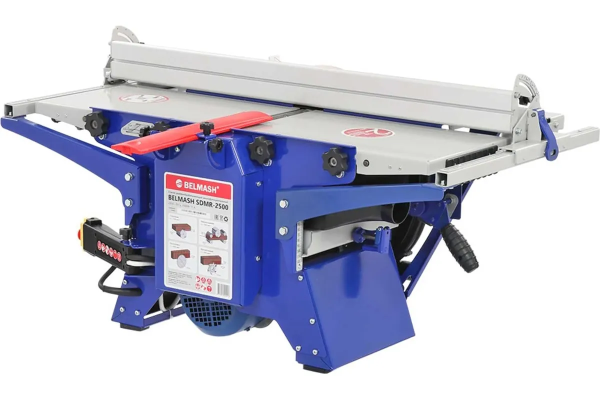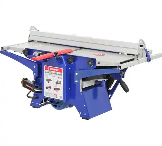 Деревообрабатывающий станок многофункциональный Белмаш SDMR-2500 используется для универсальной обработки деревянных заготовок. Основные функции изделия: распиловка, строгание, рейсмусование, фрезерование. Небольшие размеры позволяют использовать оборудование в домашних мастерских и на производствах без подключения к силовым линиям 380 В. Комплектация включает в себя необходимое оборудование для проведения работ всех видов. Настольная конструкция обладает необходимым весом и жесткостью, чтобы справляться с вибрацией при работе. Распиловку можно вести под углом до 45 градусов. Для пиления предусмотрен рабочий стол размерами 827х528 мм. Габариты стола для строгания составляют 912х284 мм. При рейсмусовании обеспечивается автоматическая подача заготовки со скорости до 6 метров в минуту. Для фрезерования используются фрезы диаметром 125 мм.