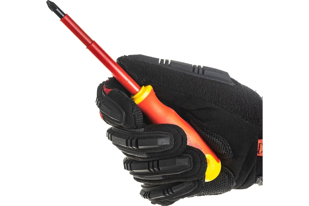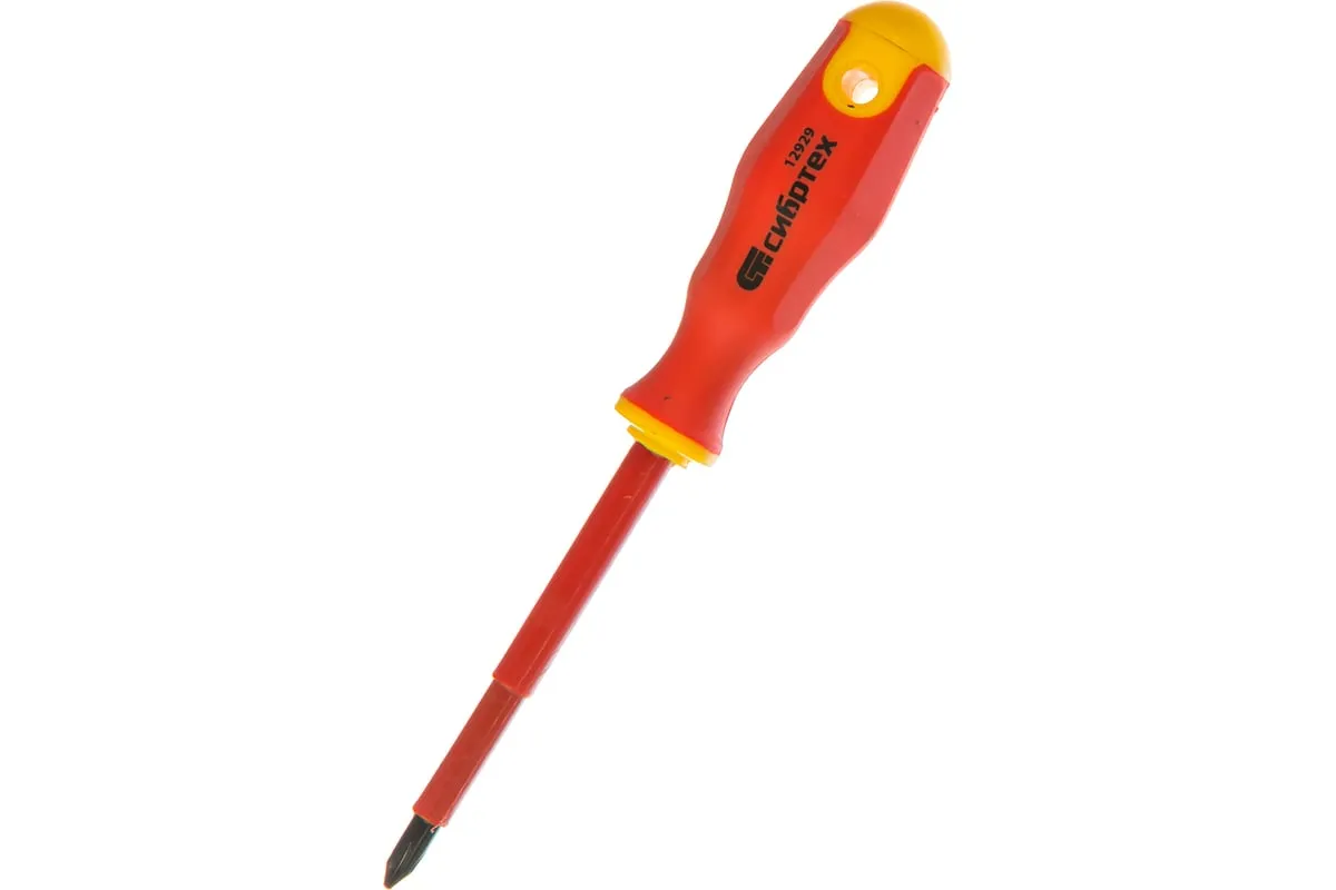 Диэлектрическая отвертка Сибртех 12929 до 1000 В, PH2 x 100 мм, из стали CrV, с двухкомпонентной рукояткой, предназначена для работы с крепежом типа Phillips «крест». Благодаря диэлектрическому покрытию она пригодится частным мастерам при замене розеток, подключении электросчетчиков и других работах. Стержня длиной 100 мм достаточно для демонтажа/монтажа крепежа в углублениях. Внимание — техника безопасности запрещает выполнять работы под напряжением!